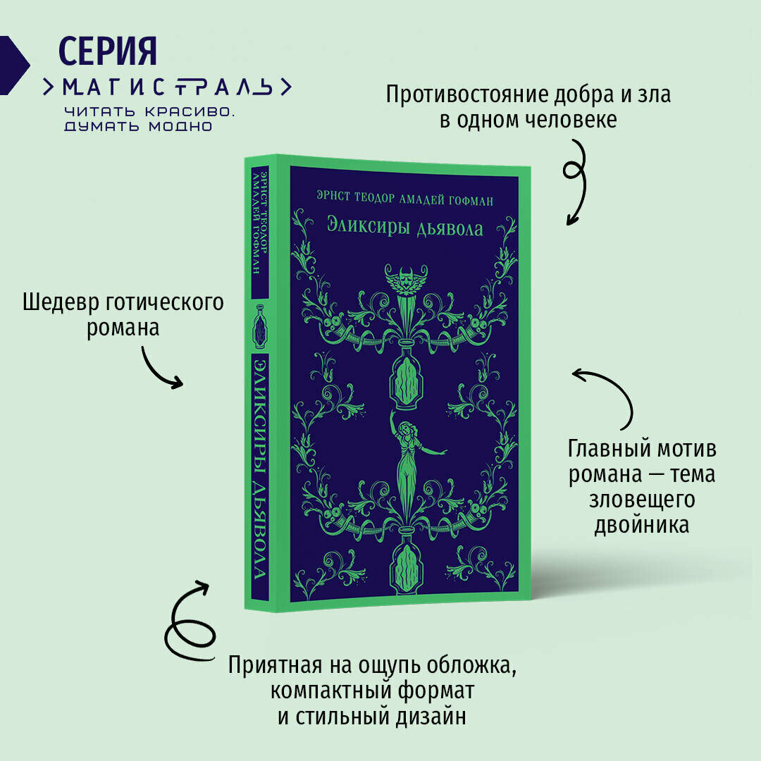 В данном издании представлен роман Эликсиры сатаны, посвященный любимой для Гофмана теме разрушительному действию темной половины человеческой личности. Причем вторжение зла в душу человека обуславливается как наследственными причинами, так и действием внешних, демонических сверхъестественных сил. Главное действующее лицо монах Медардус, случайно отведав таинственной жидкости из хрустального флакона, становится невольным носителем зла. Повествование, ведущееся от его лица, позволяет последовать по монастырским переходам и кельям, а затем по пестрому миру и испытать все, что перенес монах в жизни страшного, наводящего ужас, безумного и смехотворного