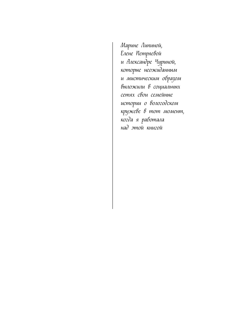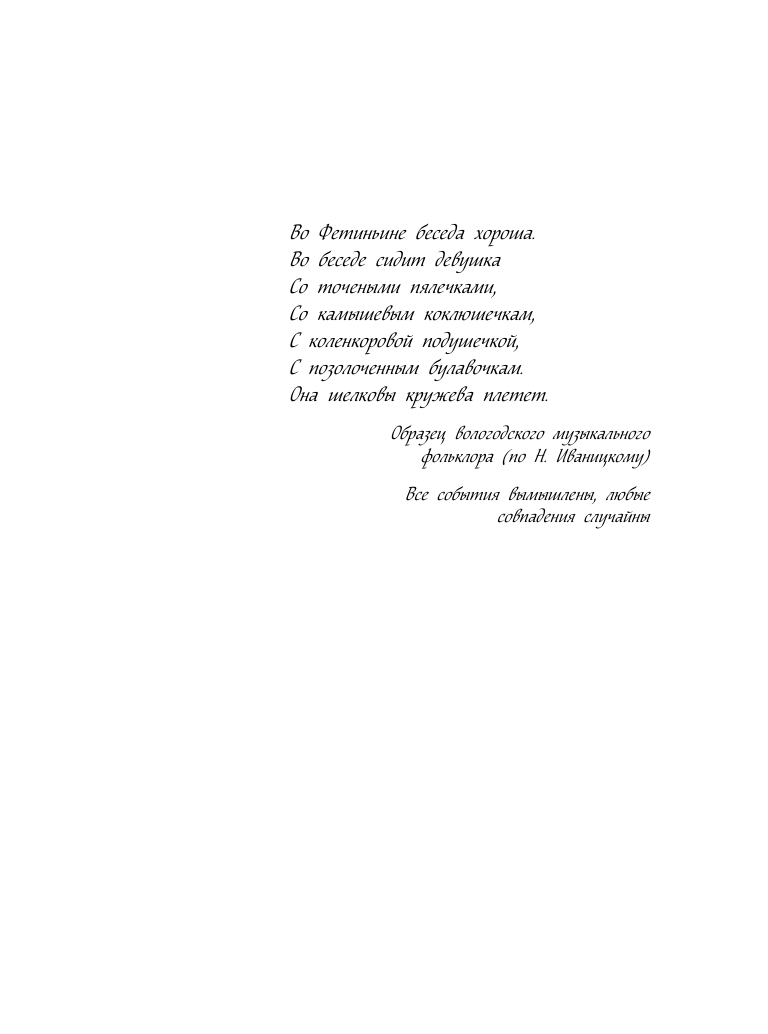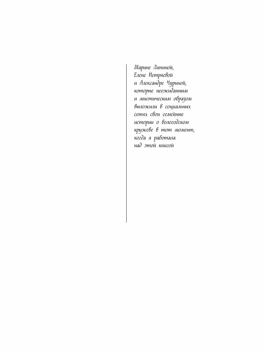Снежана Машковская вела тихую уютную жизнь с мамой и работала в ателье, где занималась любимым делом — плетением кружева. Пока к ней не обратились из полиции с просьбой об экспертизе: в лесу был найден чемодан с останками пожилой женщины, там же лежал сколок — старинный эскиз кружева. Рисунок оказался подписан, и Снежана поняла, что он имеет непосредственное отношение к истории ее семьи и создан знаменитой кружевницей Татой Макаровой, ее далекой прародительницей. Но как он связан с убийством и его жертвой? Незаметно для себя Снежана втянулась в расследование, вместе с которым в ее жизнь вошли волнующие перемены…