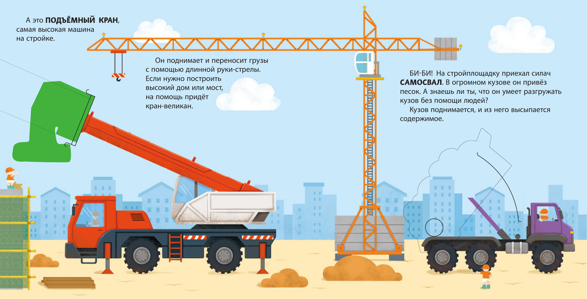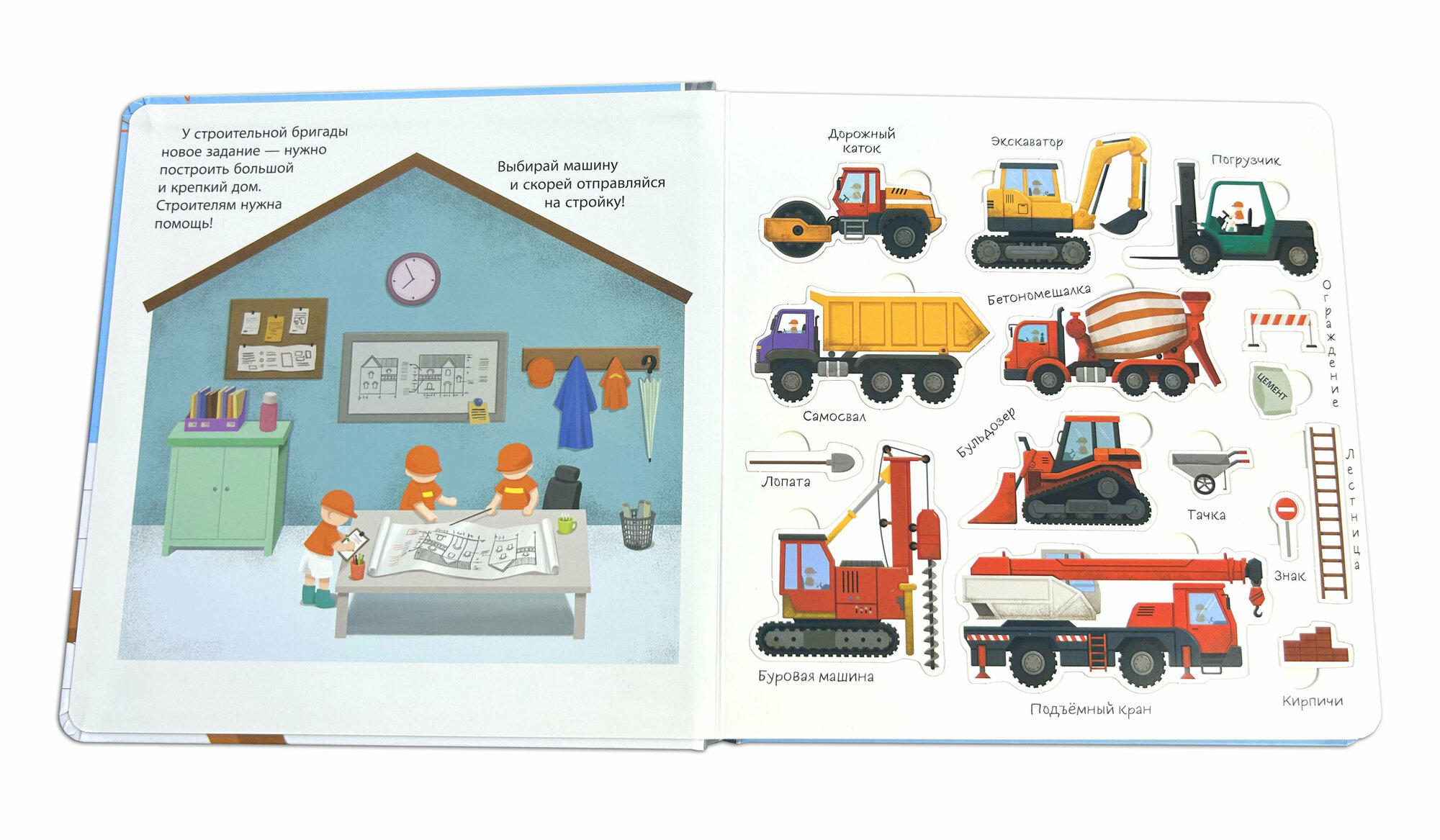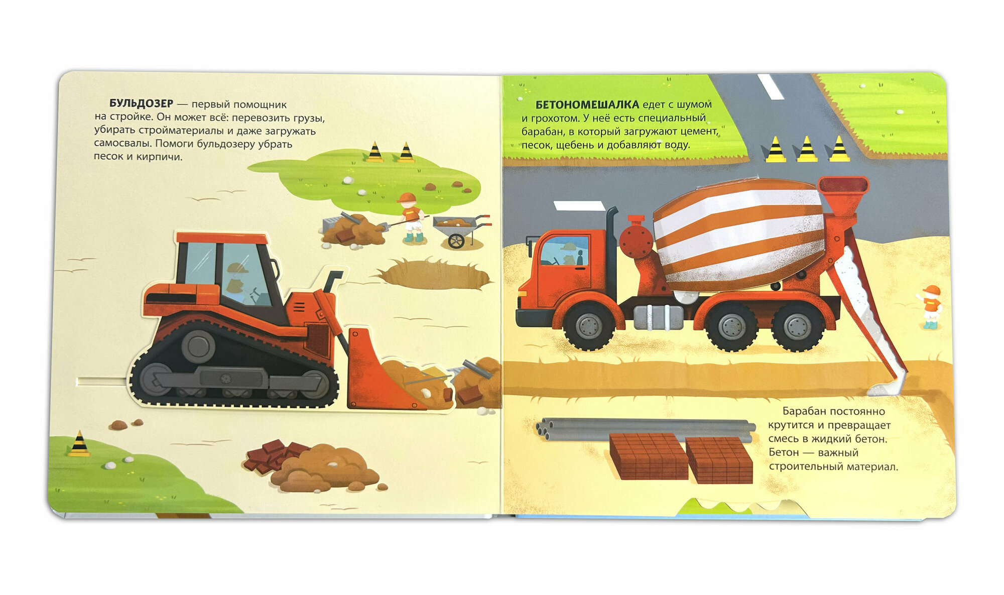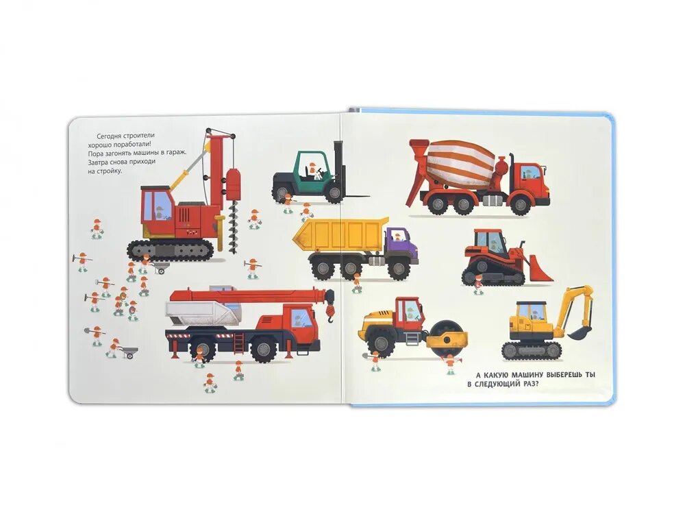 Хочешь узнать, как транспорт помогает людям выполнять самую тяжёлую работу? Тогда скорее открывай эту книжку! На её страничках ты увидишь экскаватор, бетономешалку, подъёмный кран, каток и другие машины с встроенными подвижными элементами, некоторые из которых издают звук! А теперь скорее выбирай машину и отправляйся на строительную площадку.