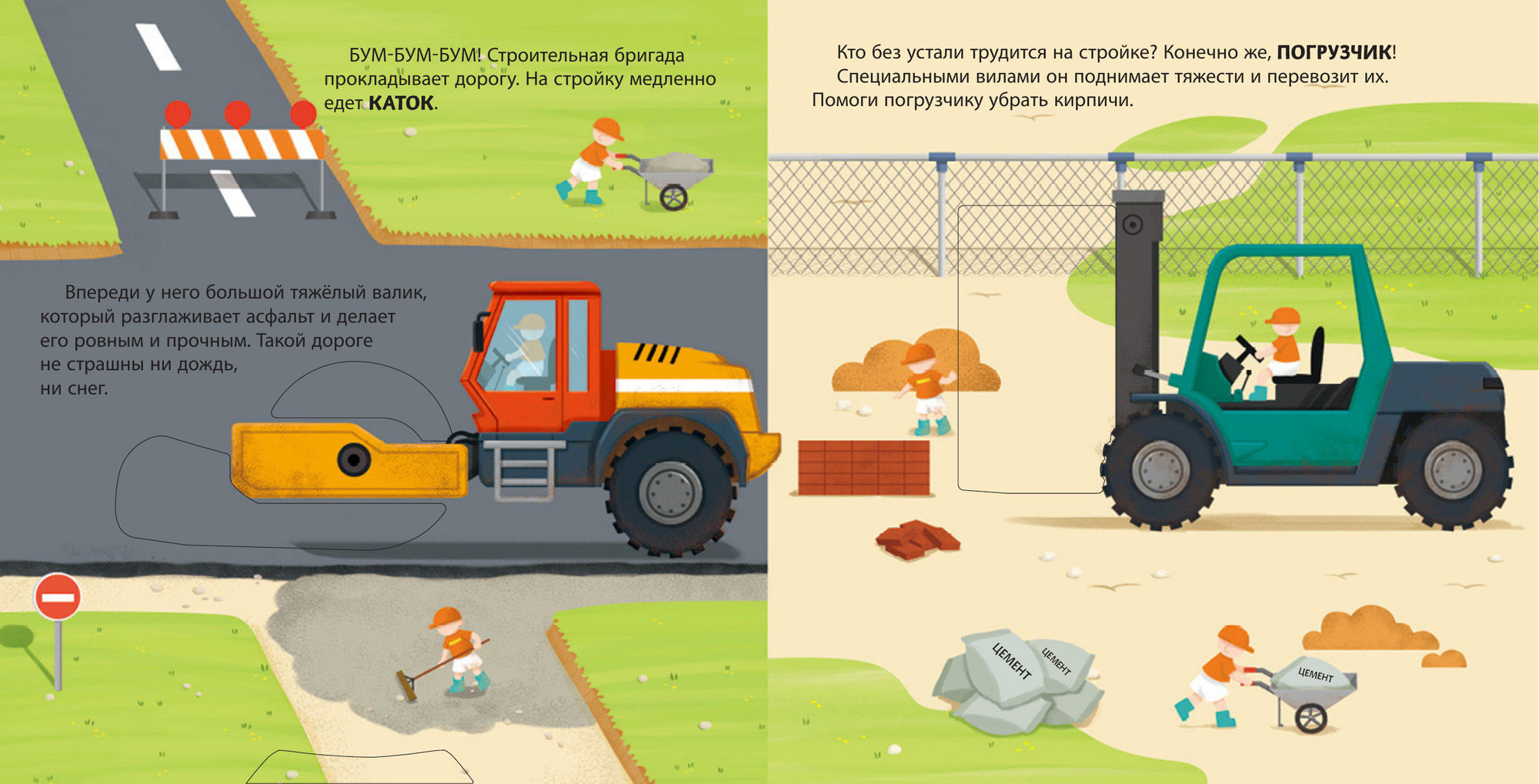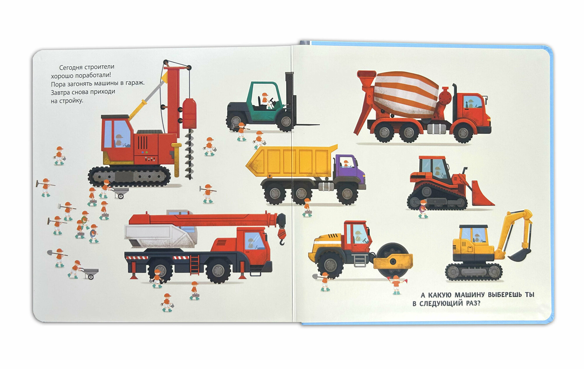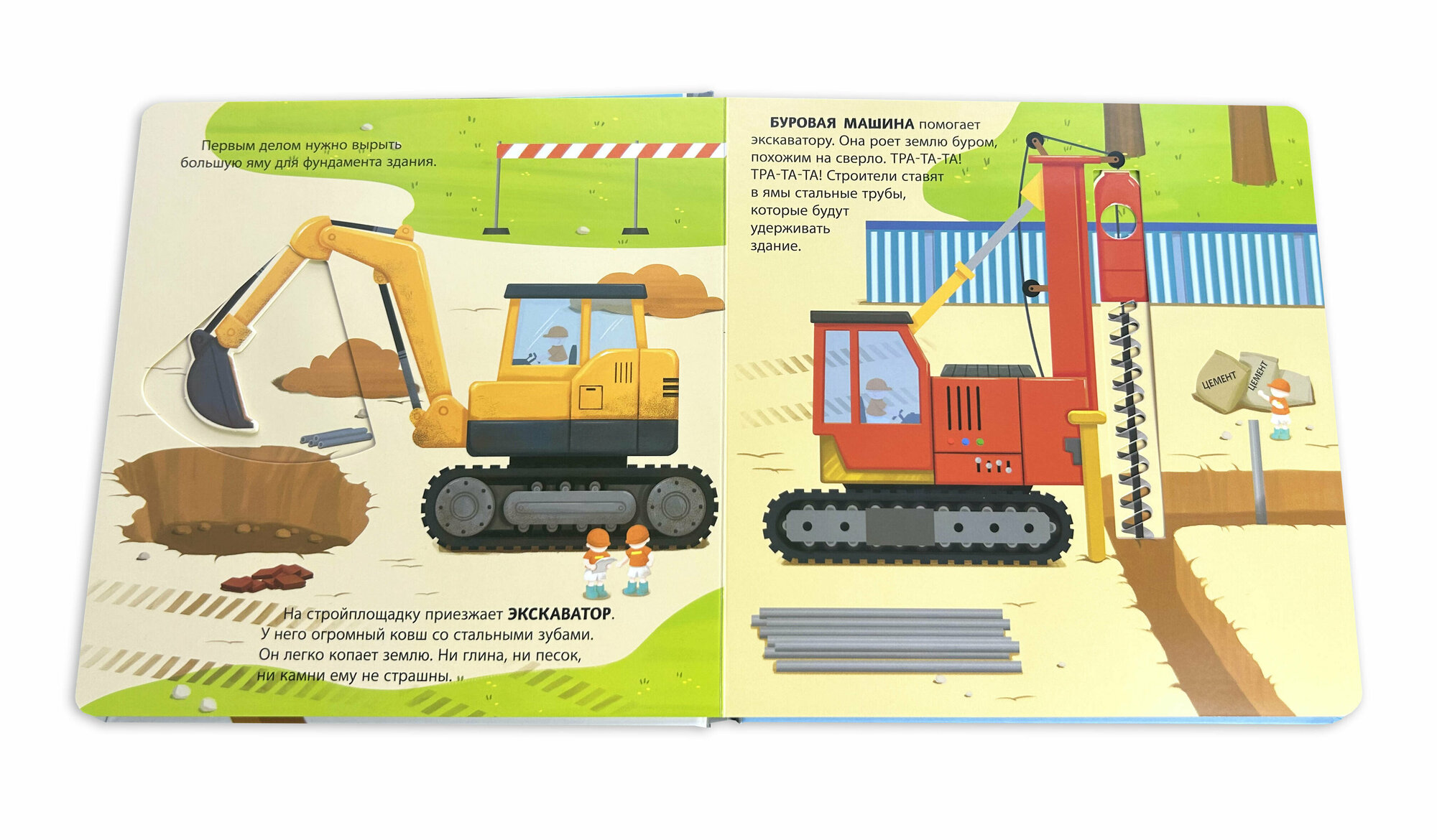 Хочешь узнать, как транспорт помогает людям выполнять самую тяжёлую работу? Тогда скорее открывай эту книжку! На её страничках ты увидишь экскаватор, бетономешалку, подъёмный кран, каток и другие машины с встроенными подвижными элементами, некоторые из которых издают звук! А теперь скорее выбирай машину и отправляйся на строительную площадку.