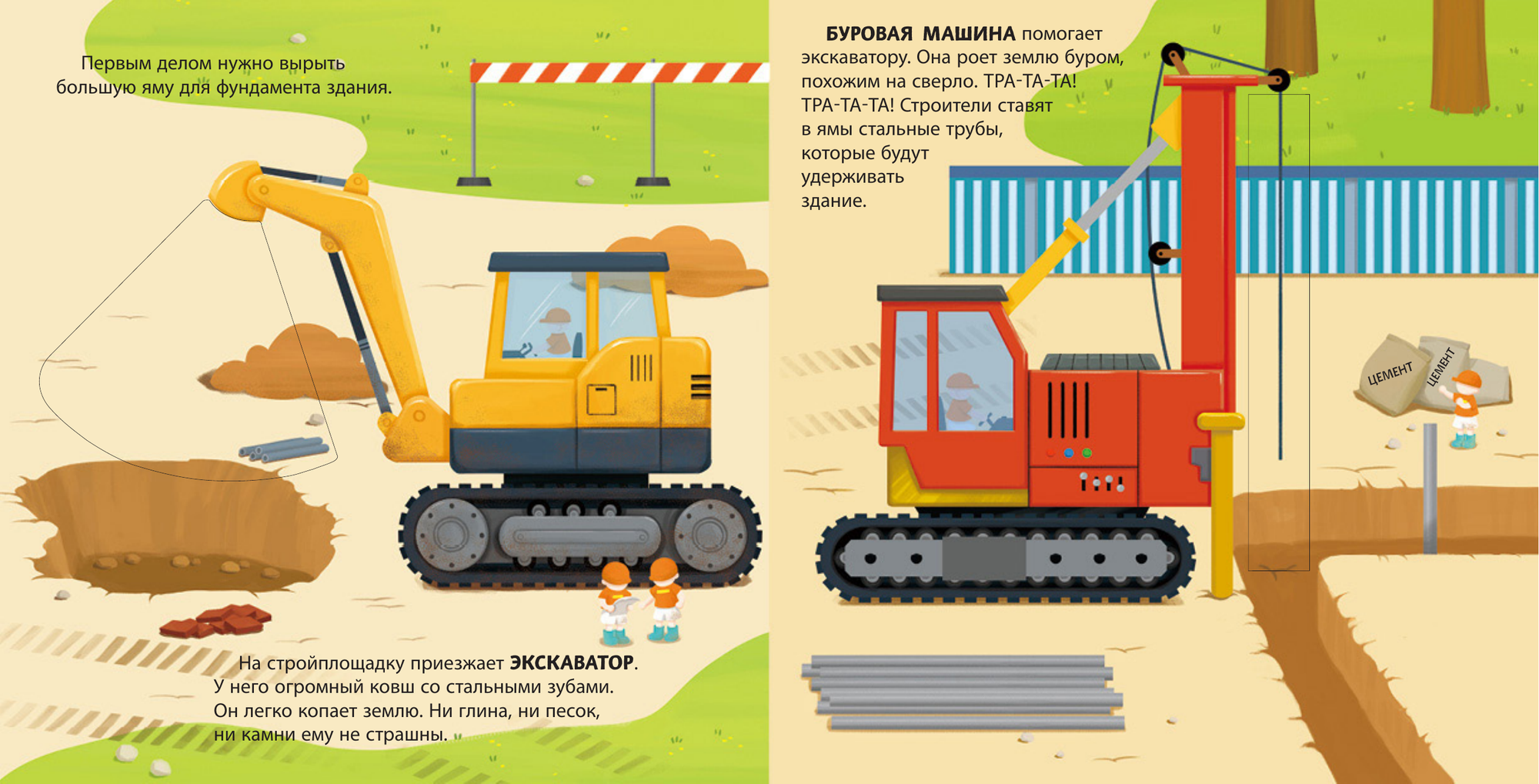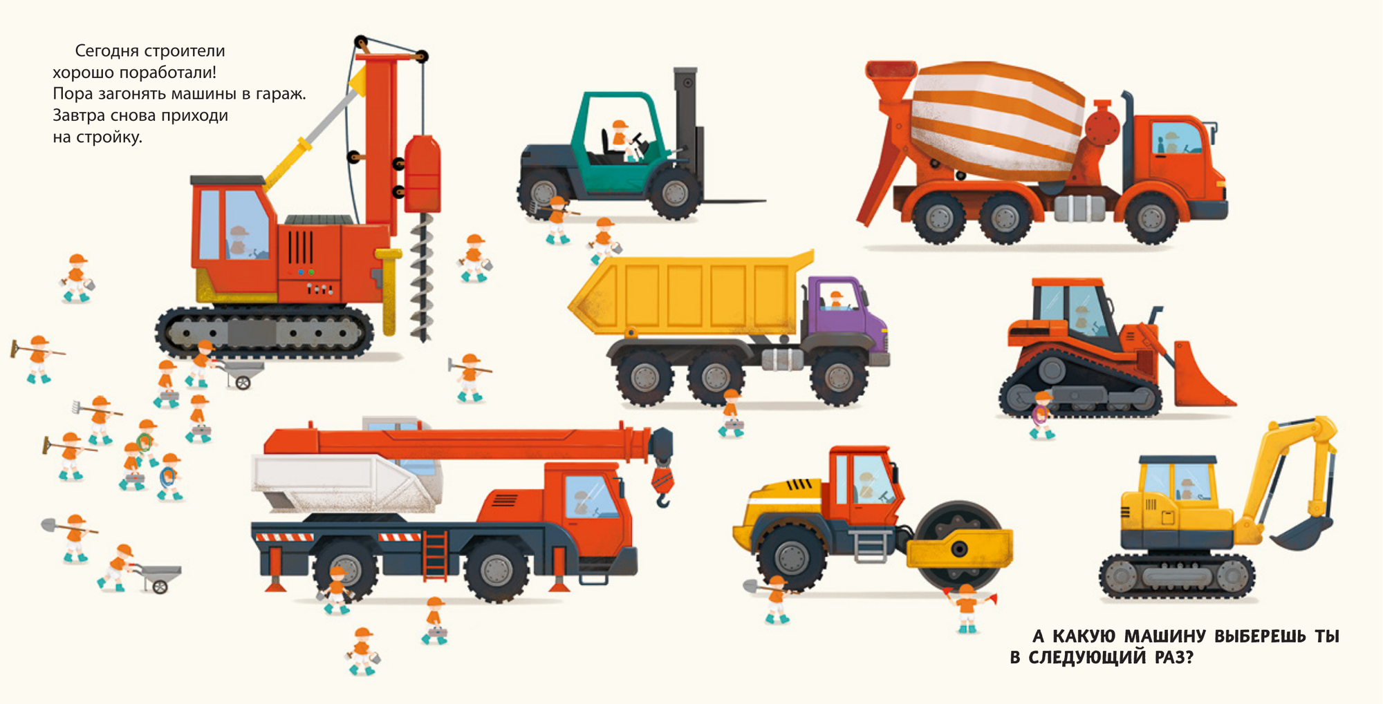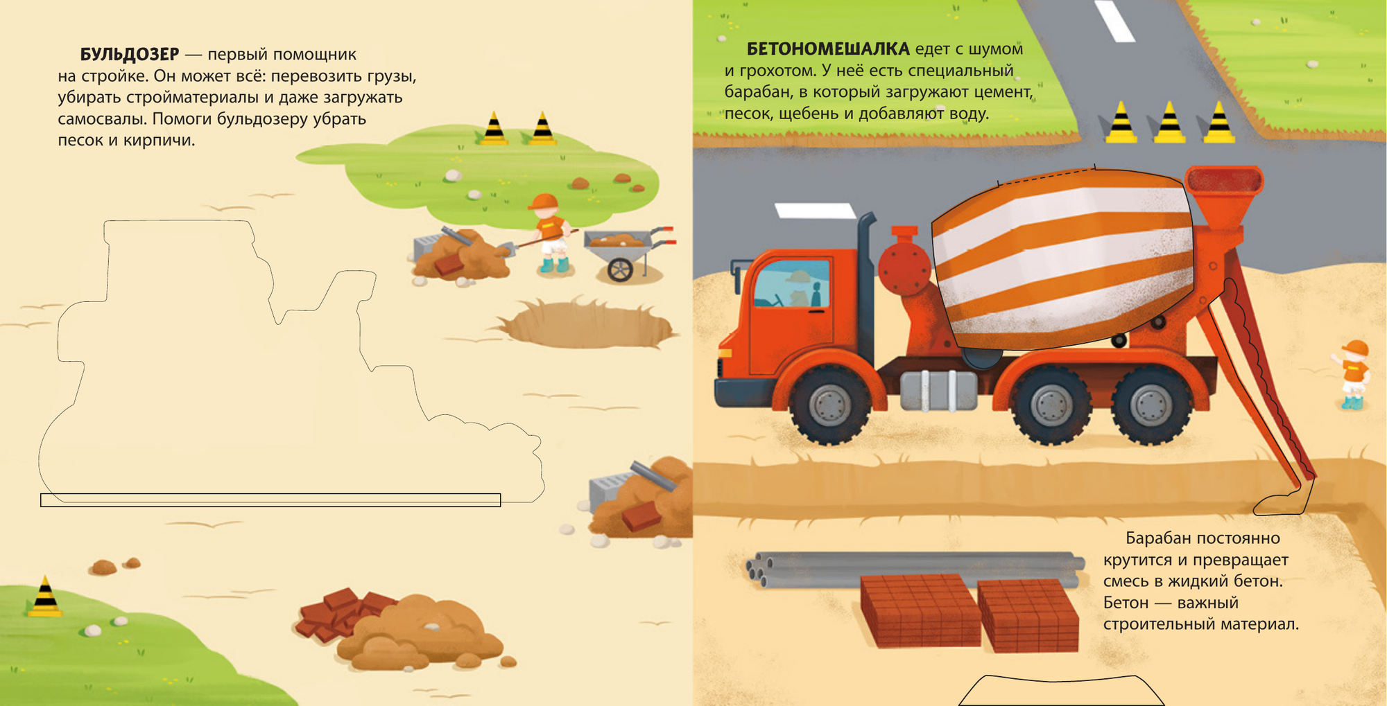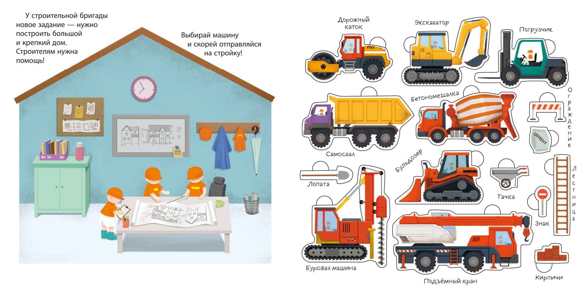 Хочешь узнать, как транспорт помогает людям выполнять самую тяжёлую работу? Тогда скорее открывай эту книжку! На её страничках ты увидишь экскаватор, бетономешалку, подъёмный кран, каток и другие машины с встроенными подвижными элементами, некоторые из которых издают звук! А теперь скорее выбирай машину и отправляйся на строительную площадку.