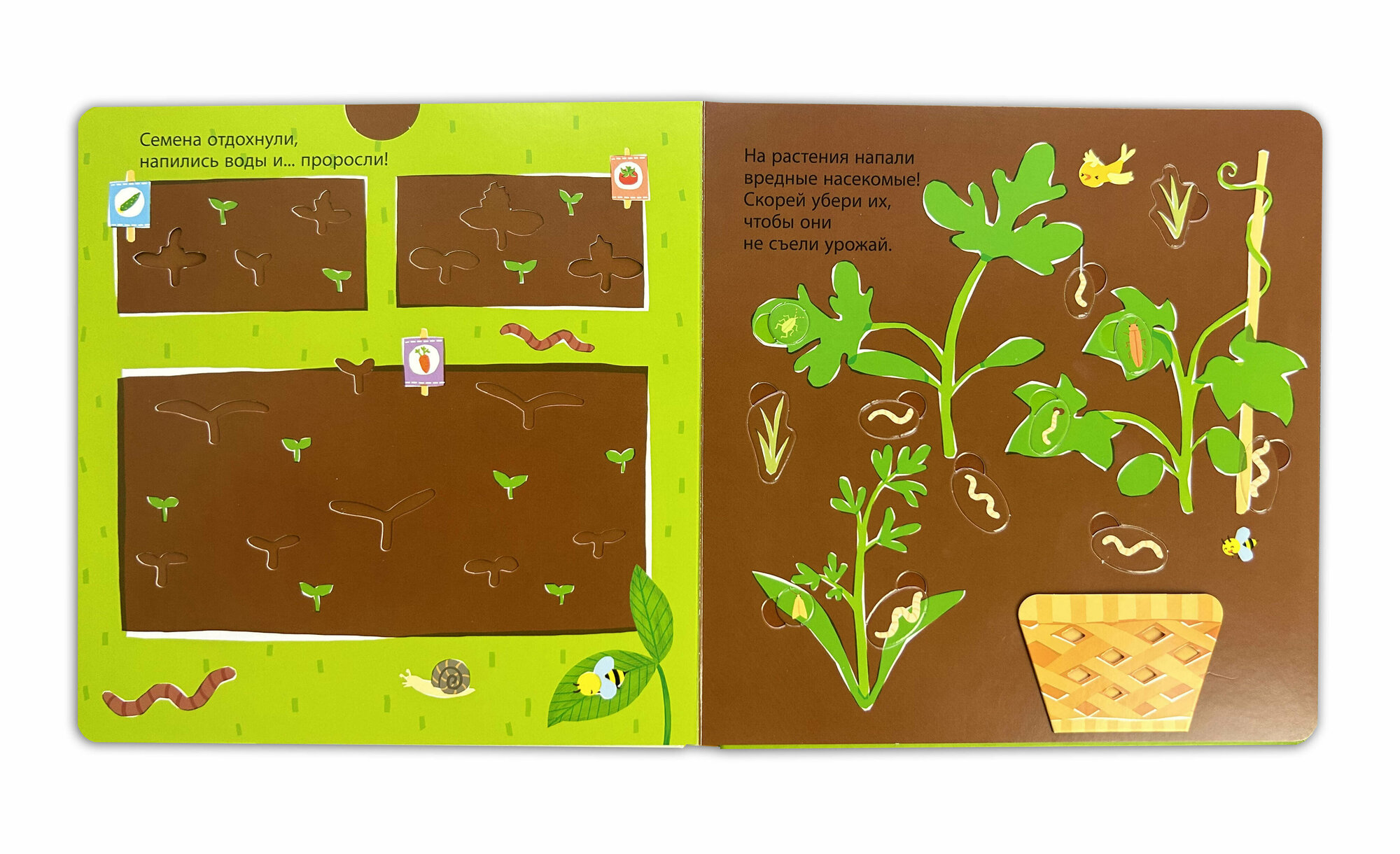 Благодаря подвижным элементам прямо на страничках книги ты сможешь выкопать ямки, прорыхлить землю, посадить и полить семена, а в конце — собрать зрелые овощи в корзину. Теперь у тебя есть свой маленький огород.