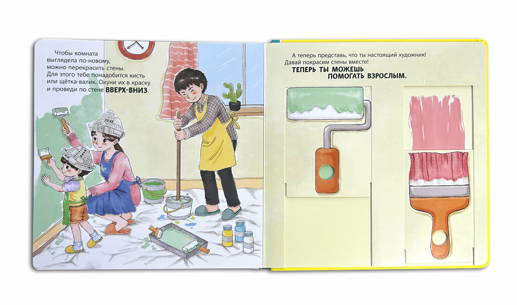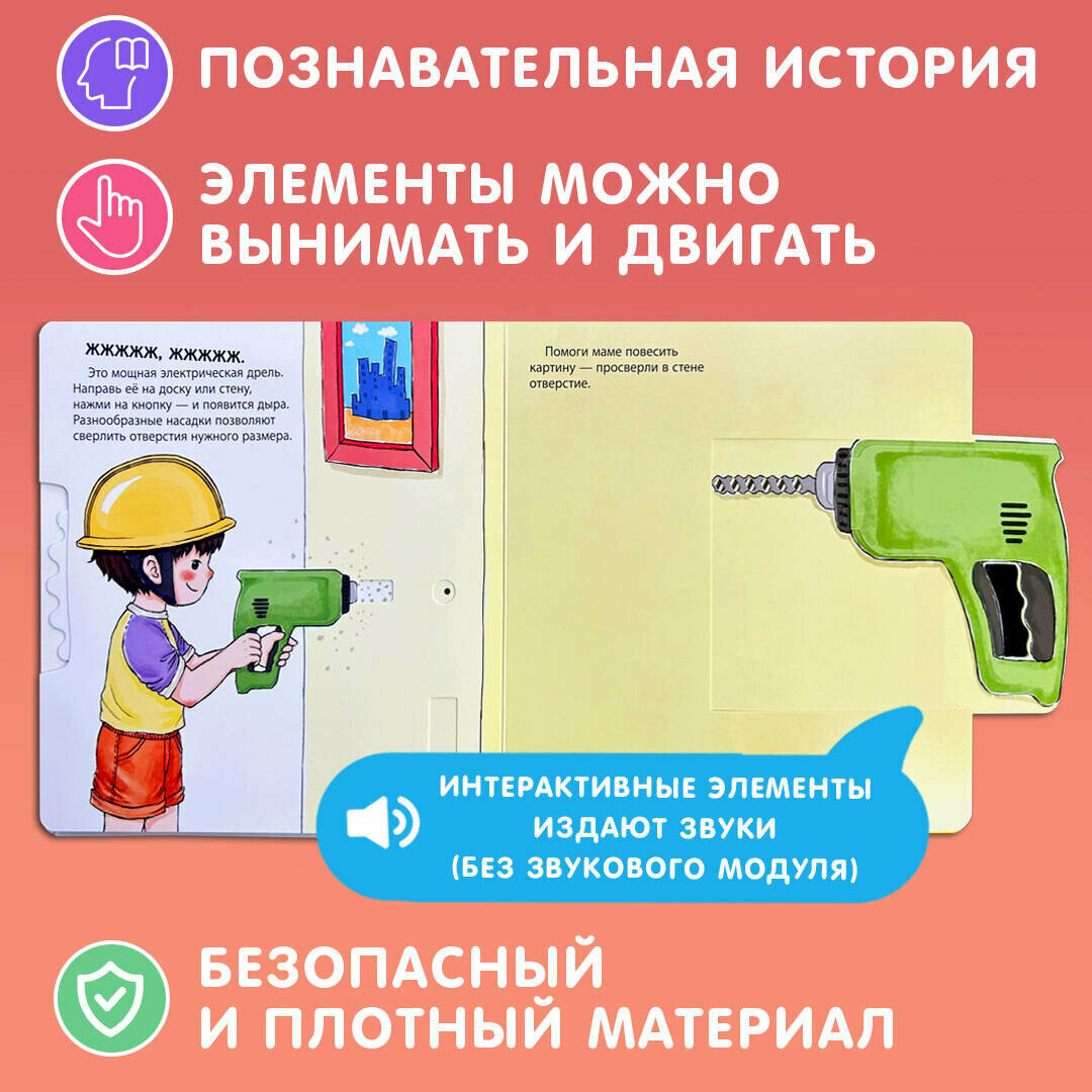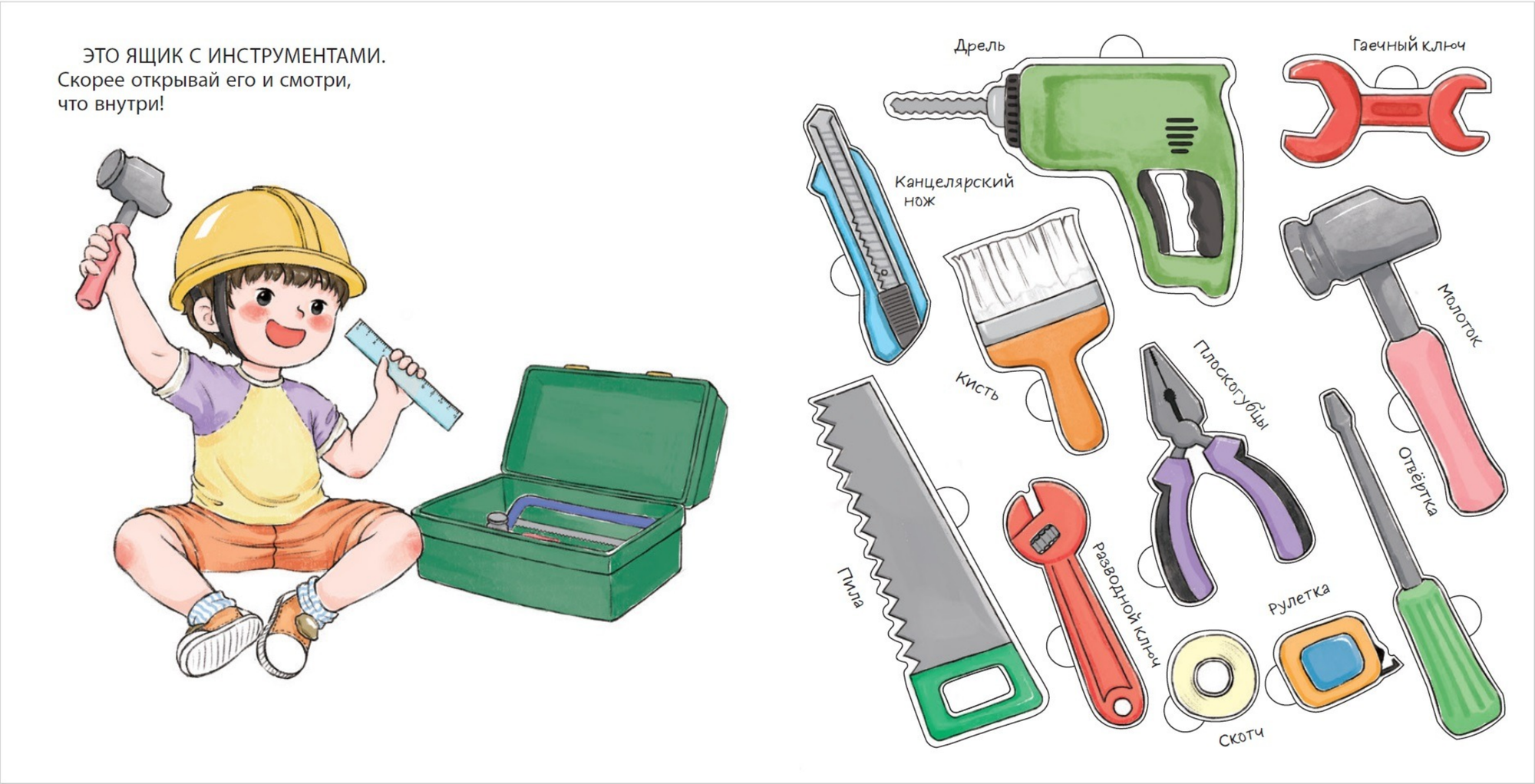 У папы есть ящик со строительными инструментами. Теперь он есть и у тебя. Открывай книжку, доставай со страничек отвёртку, гаечный ключ, молоток и начинай играть! Благодаря подвижным элементам, которые выглядят и работают, как настоящие, ты сможешь просверлить отверстие, закрутить гайку, забить гвоздь и не только! А ещё некоторые элементы издают звук! Теперь ты можешь помогать взрослым.