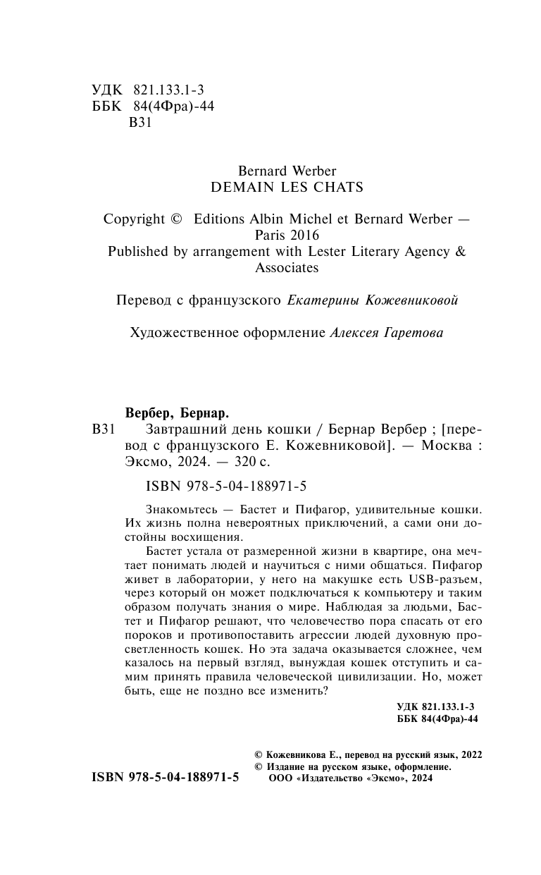 Книга: Завтрашний день кошки (Бернар Вербер); Эксмо, Редакция 1, 2023