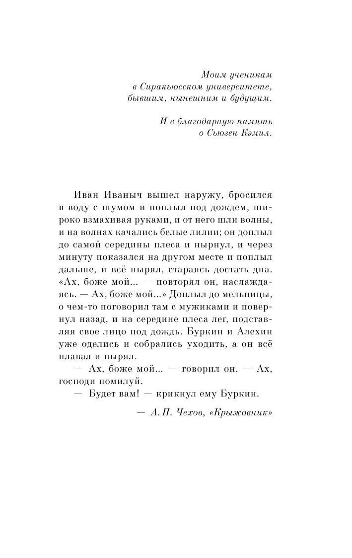 «Слава великого русского романа огромна; великому русскому рассказу повезло меньше. Американский писатель и преподаватель Джордж Сондерс пробует исправить эту несправедливость — и показывает, как по-новому взглянуть на короткие вещи Чехова, Тургенева, Толстого и Гоголя. В его остроумных и педантичных разборах различаешь жар фаната и холод исследователя — сочетание, которое присуще каждому хорошему читателю и сочинителю художественной прозы. Собственно, будущим авторам эта книга во многом и предназначена: «Купание в пруду под дождем» — одно из лучших пособий по литературному мастерству, книга с той же полки, что и набоковские «Лекции по литературе» или филологические эссе Кутзее». — Игорь Кириенков, книжный критик, автор «Полки»