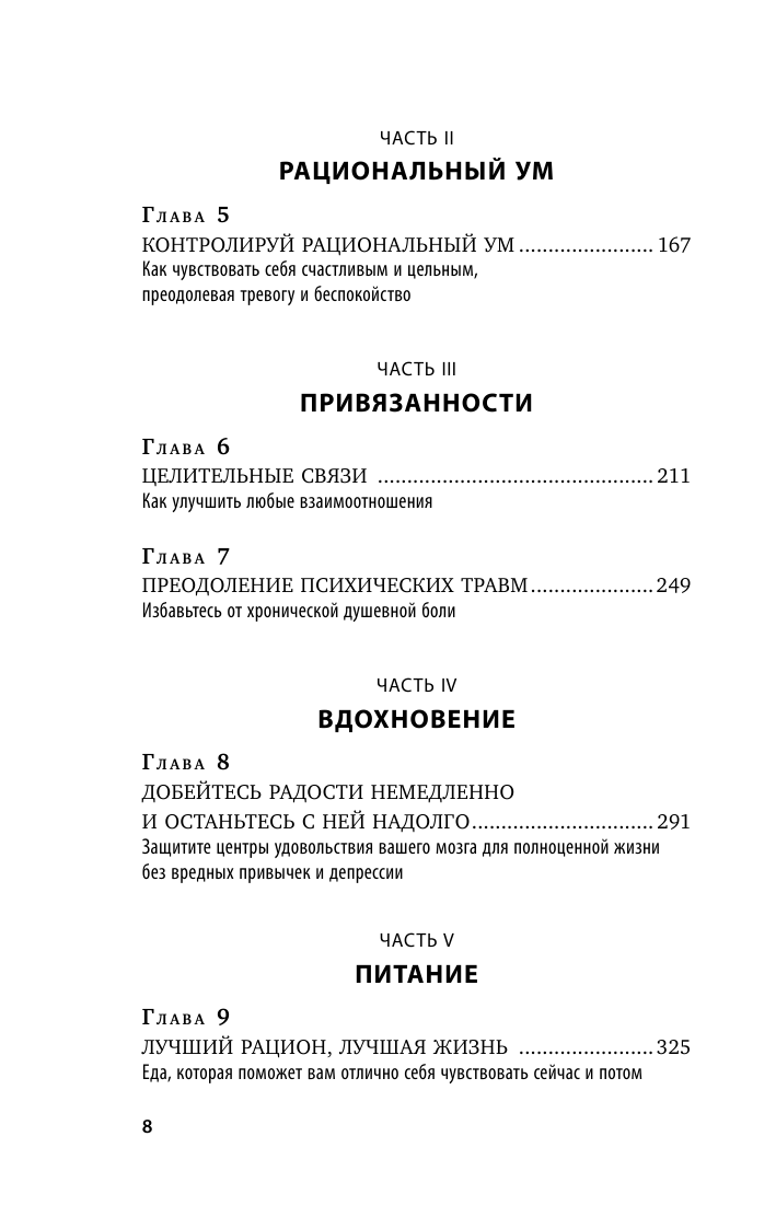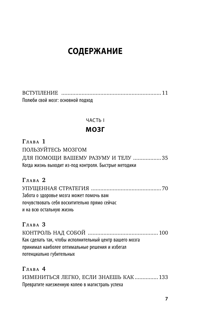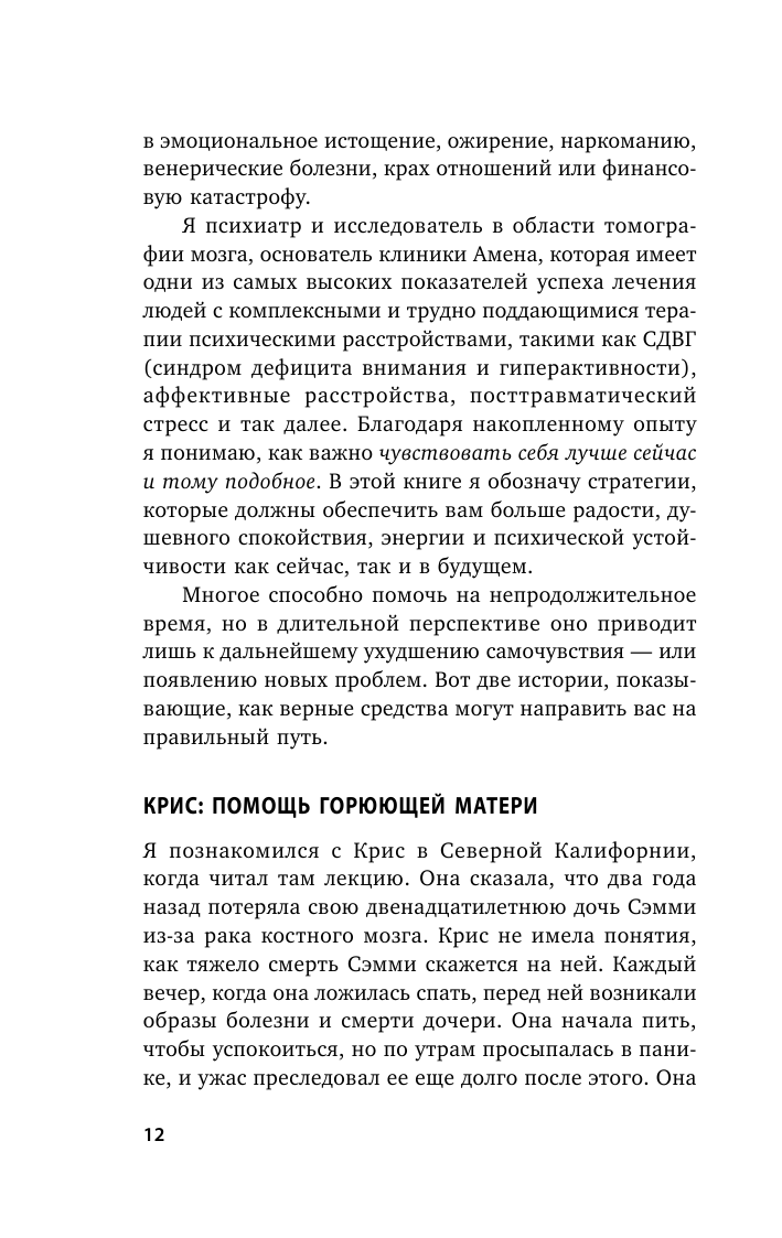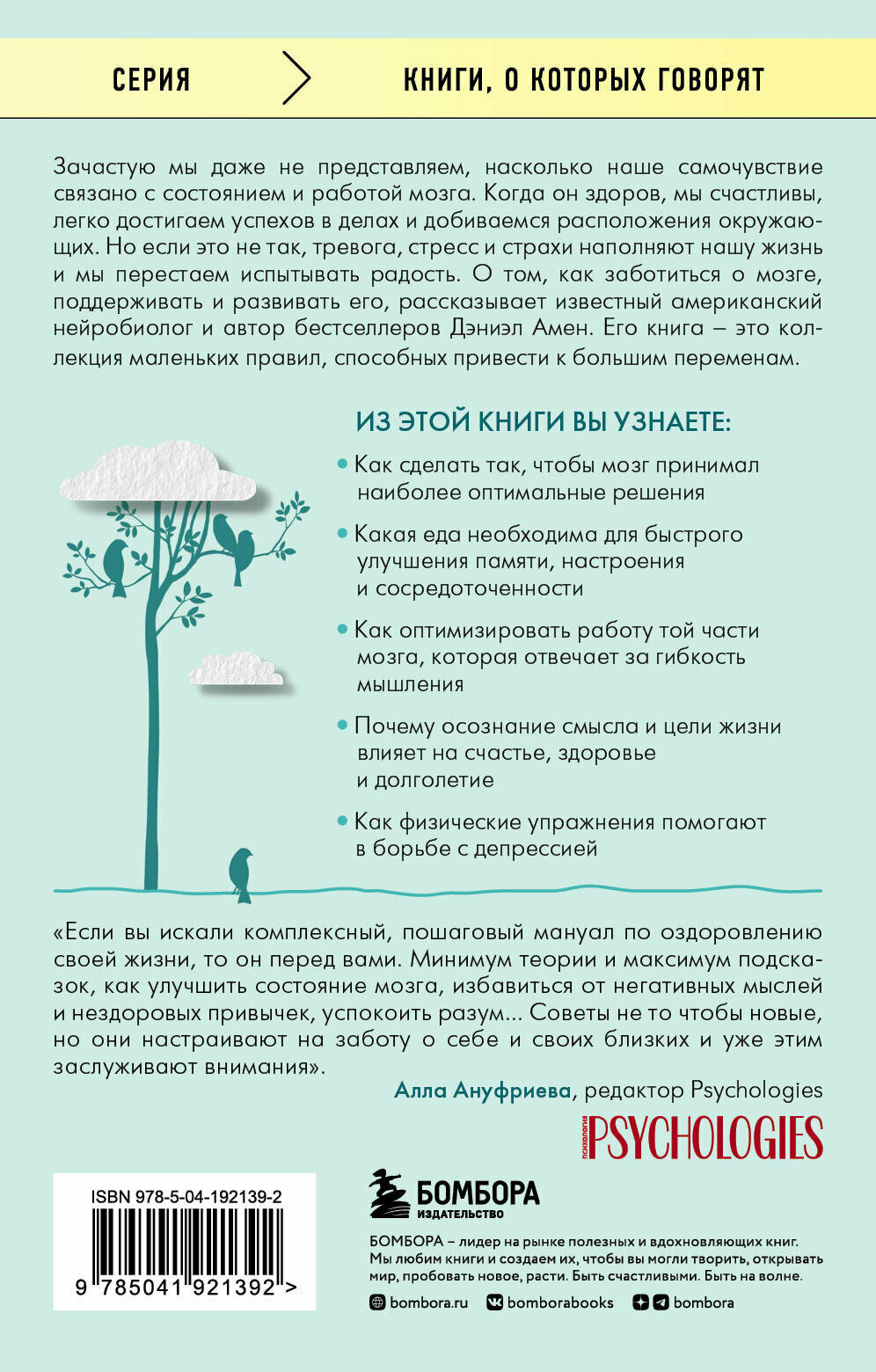 В счастливом человеке — здоровый мозг! И для известного американского нейробиолога и автора бестселлеров Дэниэла Амена это давно подтвержденный факт. Его клинический опыт и исследования показывают: наше физиологическое состояние напрямую влияет на эмоции, чувства, мысли и отношения, область психологическую, социальную и духовную. Почувствовать улучшение в каждой из этих сфер можно, если беречь свой мозг и развивать его. О методах, способных помочь решению этих задач, автор увлекательно рассказывает на страницах своей книги.