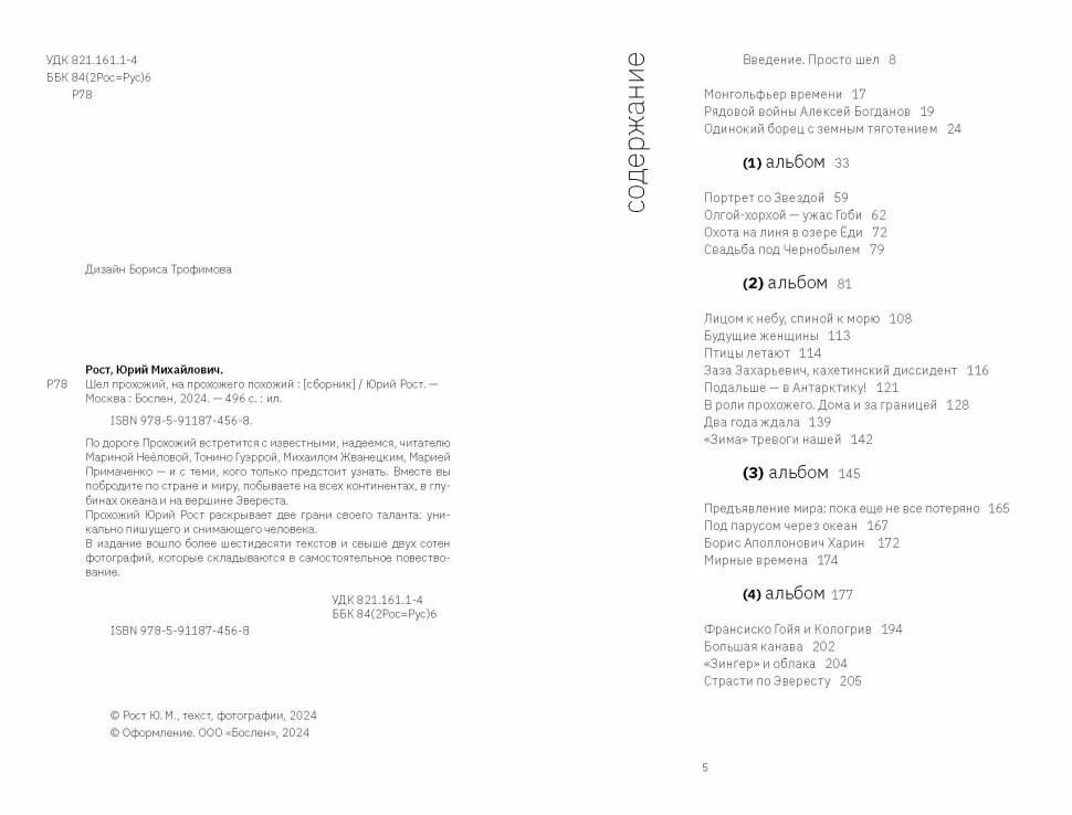 По дороге Прохожий встретится с известными, надеемся, читателю Мариной Неёловой, Тонино Гуэррой, Михаилом Жванецким, Марией Примаченко — и с теми, кого только предстоит узнать. Вместе вы побродите по стране и миру, побываете на всех континентах, в глубинах океана и на вершине Эвереста. Прохожий Юрий Рост раскрывает две грани своего таланта: уникально пишущего и снимающего человека. В издание вошло более шестидесяти текстов и свыше двух сотен фотографий, которые складываются в самостоятельное повествование.