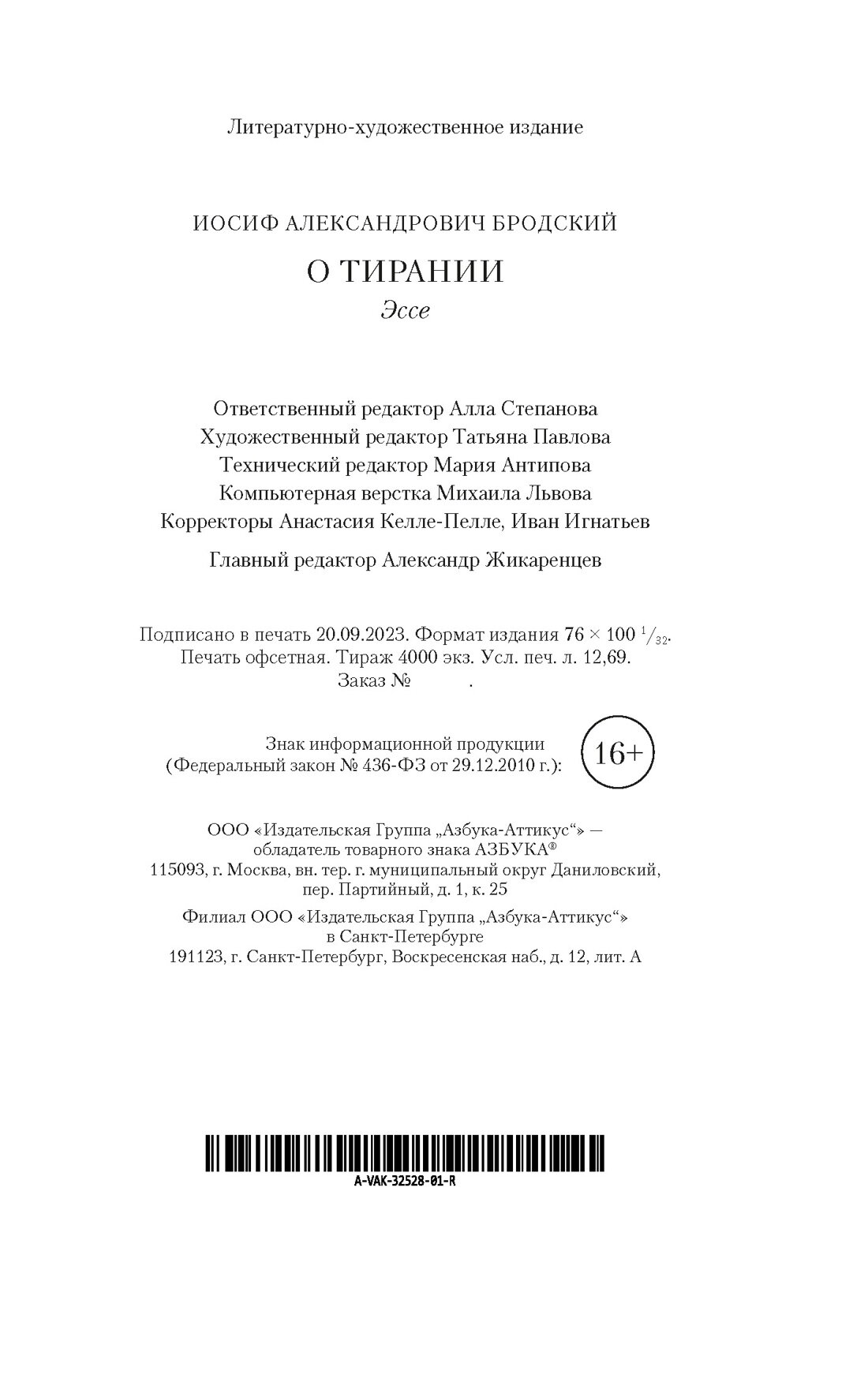 Книга: О тирании. Эссе (Бродский Иосиф Александрович); Азбука, 2023