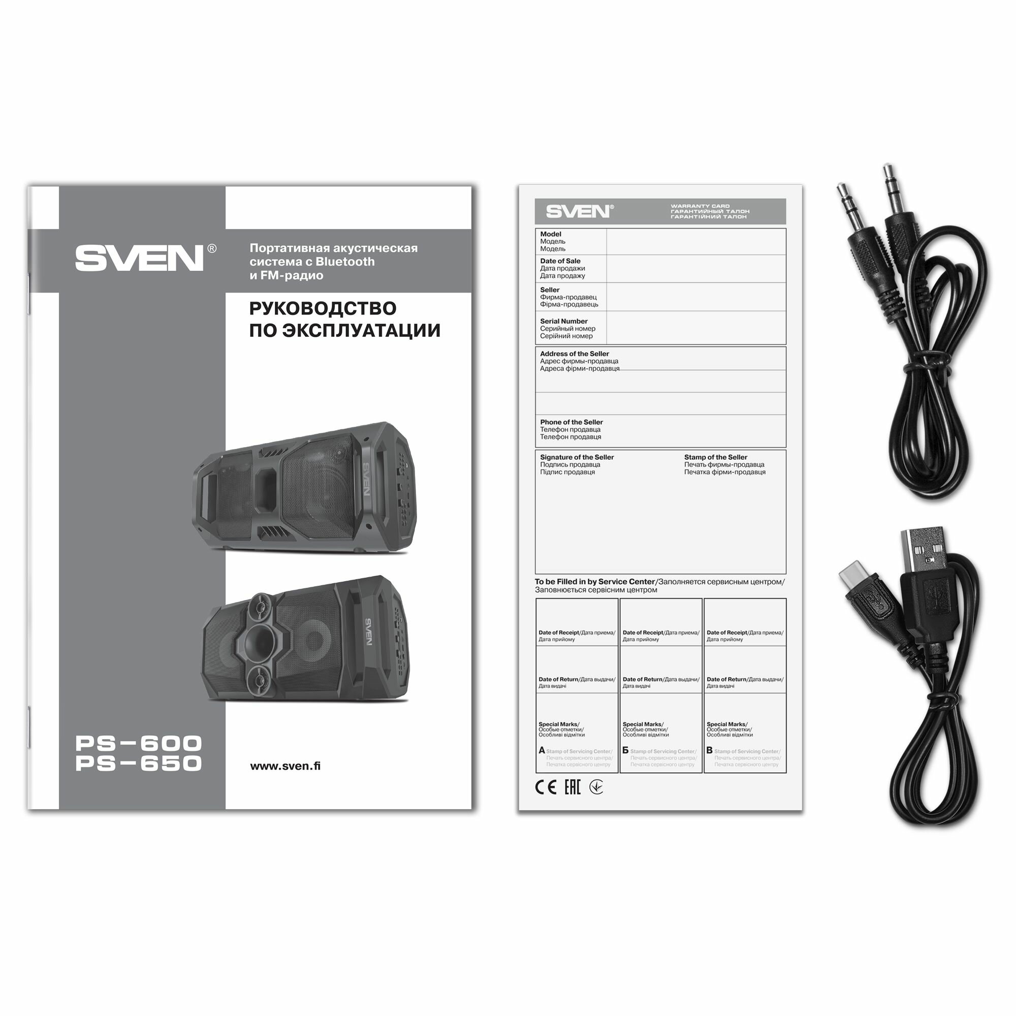 | Прочие особенности и свойства | Праздник начинается там, где появляется портативная акустика SVEN PS-650. Агрессивный дизайн с округлой формой элементов лицевой панели сразу дает понять — перед нами устройство, способное стать центром любой вечеринки. Мощность колонки — 50 Вт, звучит она по-настоящему громко. А благодаря возможности подключения двух колонок к одному источнику можно добиться стереозвучания, дополнительно увеличить мощность и устроить настоящую дискотеку без единого провода., , Не менее впечатляющим является качество звучания SVEN PS-650. Сбалансированный звук с объемным басом и широкий частотный диапазон от 45 Гц до 22 кГц обеспечивают сразу две пары динамиков — высокочастотные диаметром 35 мм и низкочастотные диаметром 100 мм. Скорректировать звучание можно с помощью встроенного эквалайзера., , Одна из ключевых особенностей устройства — это наличие микрофонного входа с регулировкой громкости и функцией эхо, придающей дополнительный объем вокалу. Стоит подключить к SVEN PS-650 микрофон, как она превращается в портативную караоке-станцию. За «спецэффекты» отвечает динамическая подсветка динамиков., , К источнику SVEN PS-650 подключается посредством Bluetooth, также возможны проводное соединение и воспроизведение файлов, записанных на USB-flash и microSD. Если коллекции треков под рукой не оказалось — можно воспользоваться встроенным FM-радио. Удобство использования тоже на высоте: вся информация о работе отображается на ярком LED-дисплее, для переноски предусмотрена удобная ручка. Долгую работу SVEN PS-650 гарантируют два литий-ионных аккумулятора по 4000 мAч. |