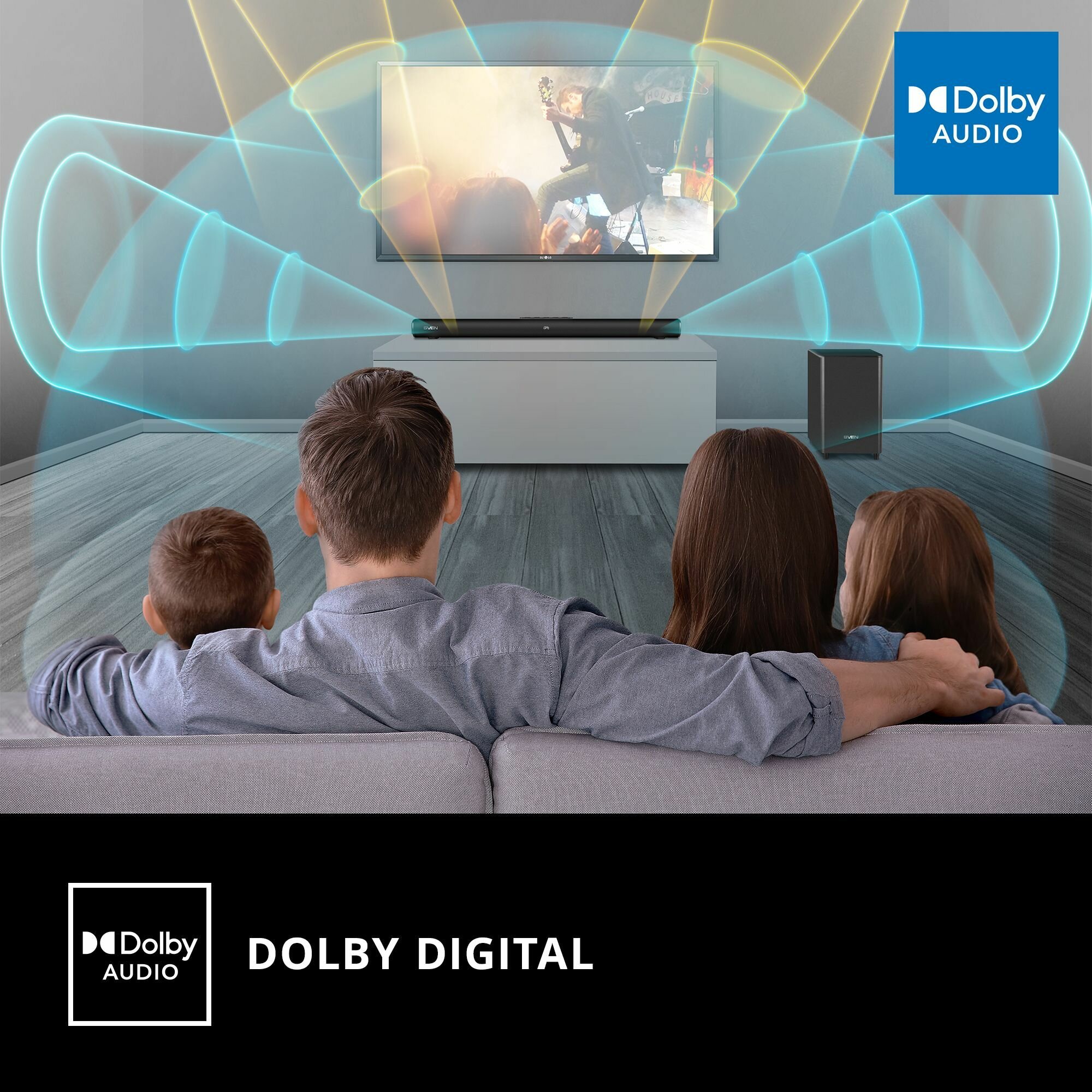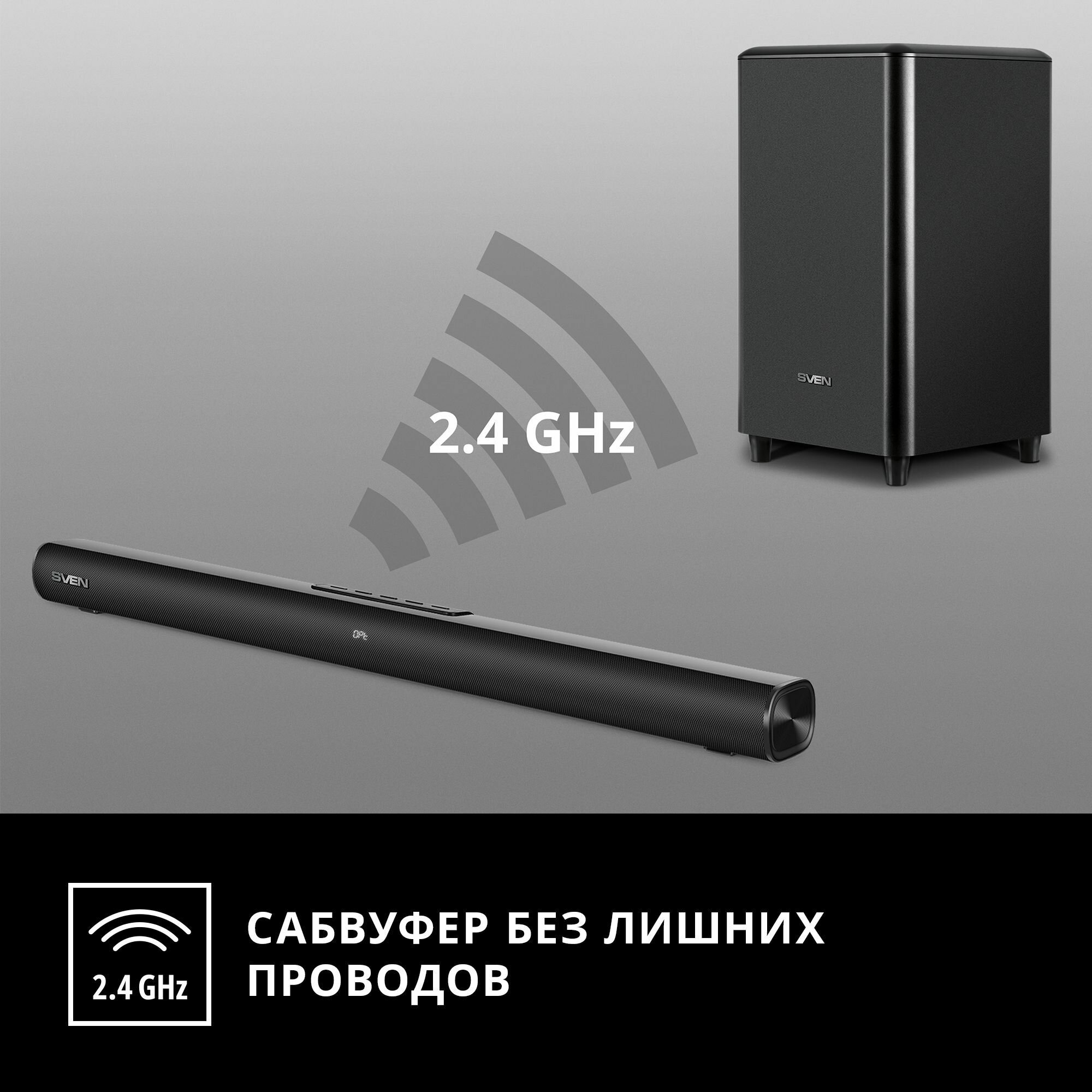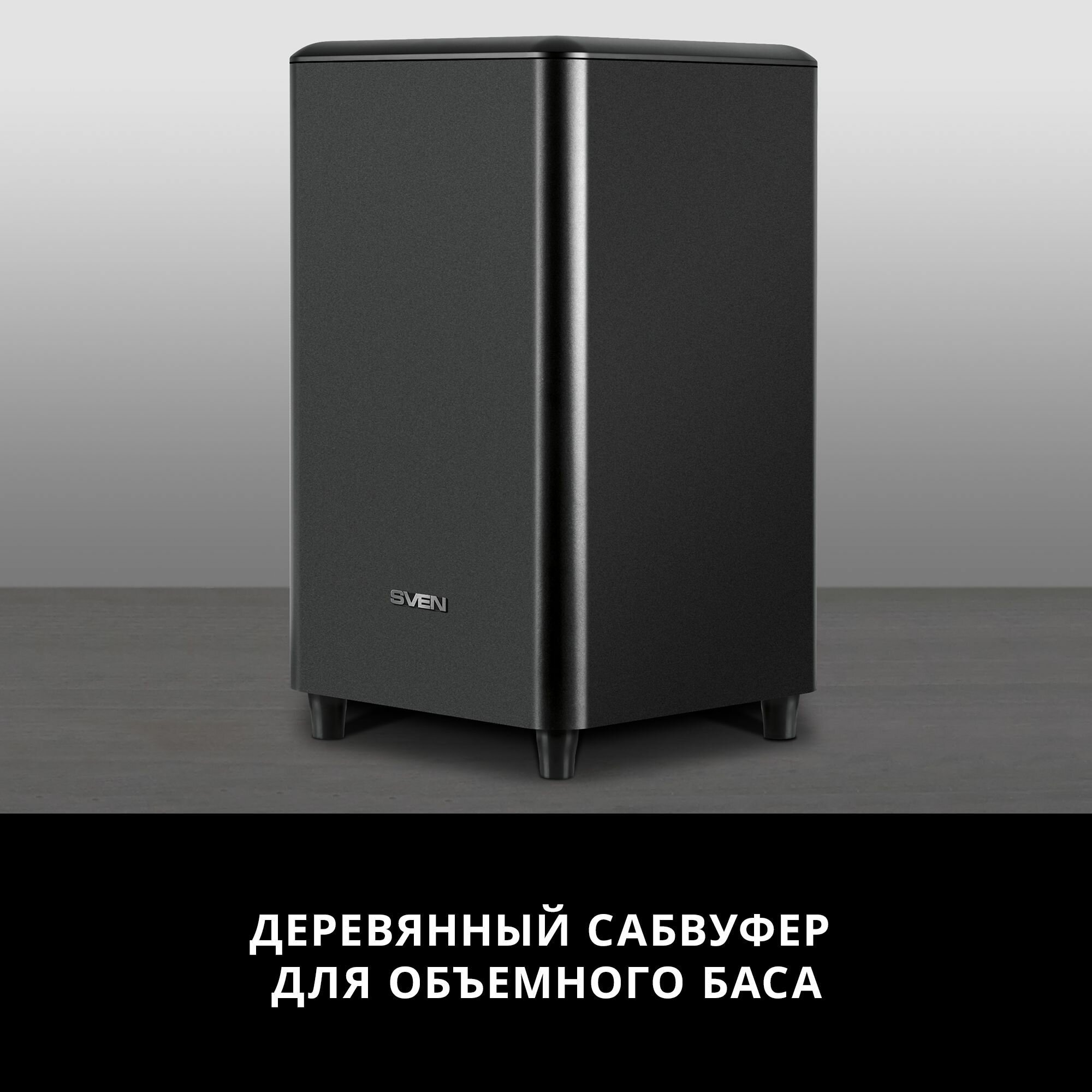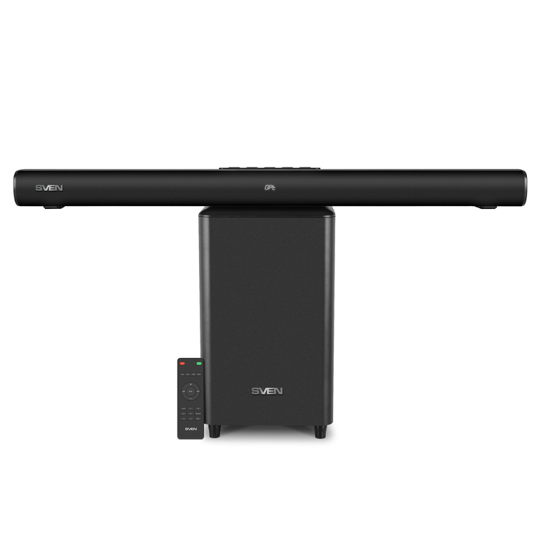 Динамики саундбара диаметром 52 мм радуют качественной передачей средне- и высокочастотного диапазона, а басовую поддержку осуществляет активный сабвуфер с корпусом из MDF, внутри которого размещен динамик диаметром 190 мм. Общая мощность системы составляет внушительные 300 Вт – SVEN будет уверенно себя чувствовать даже в большой гостиной.