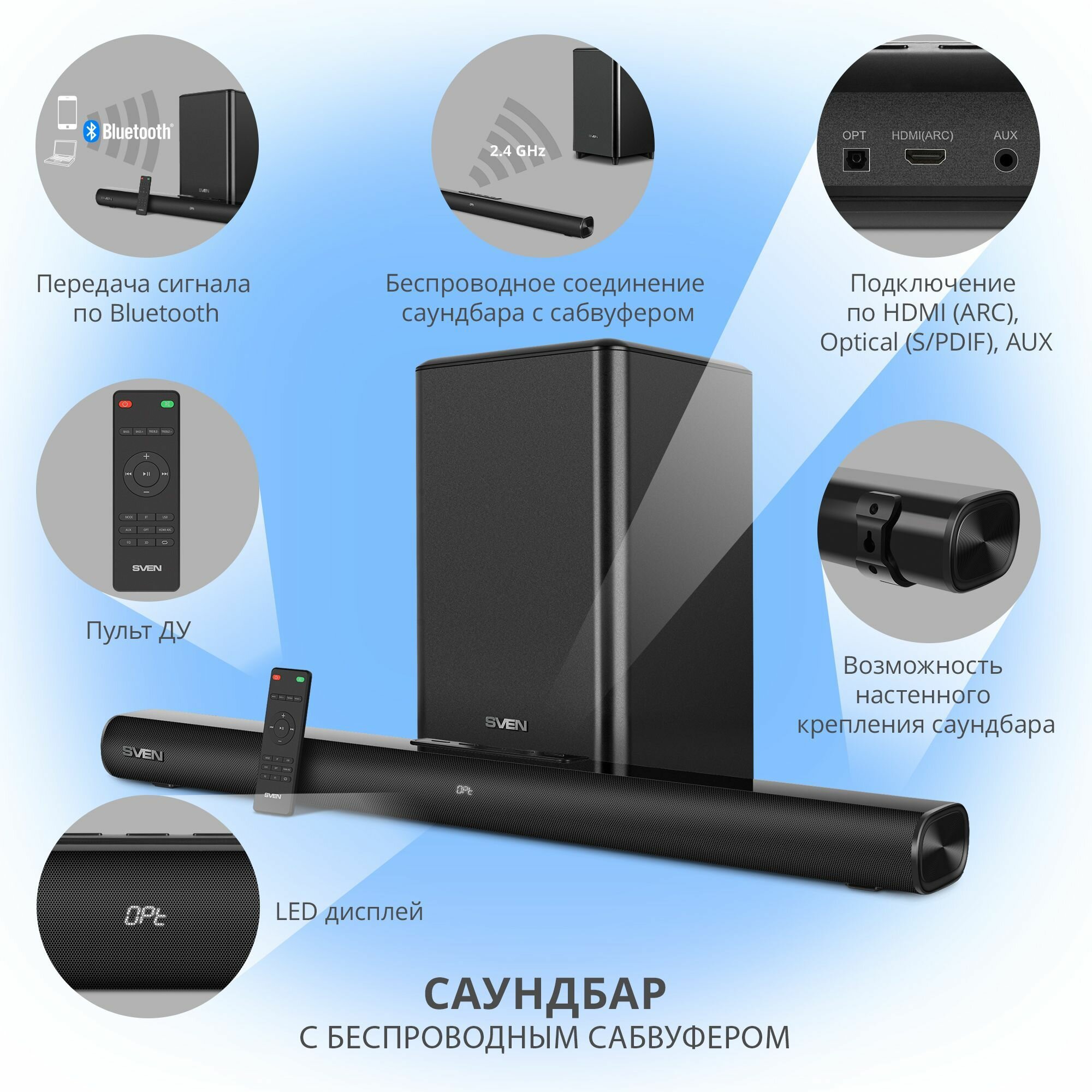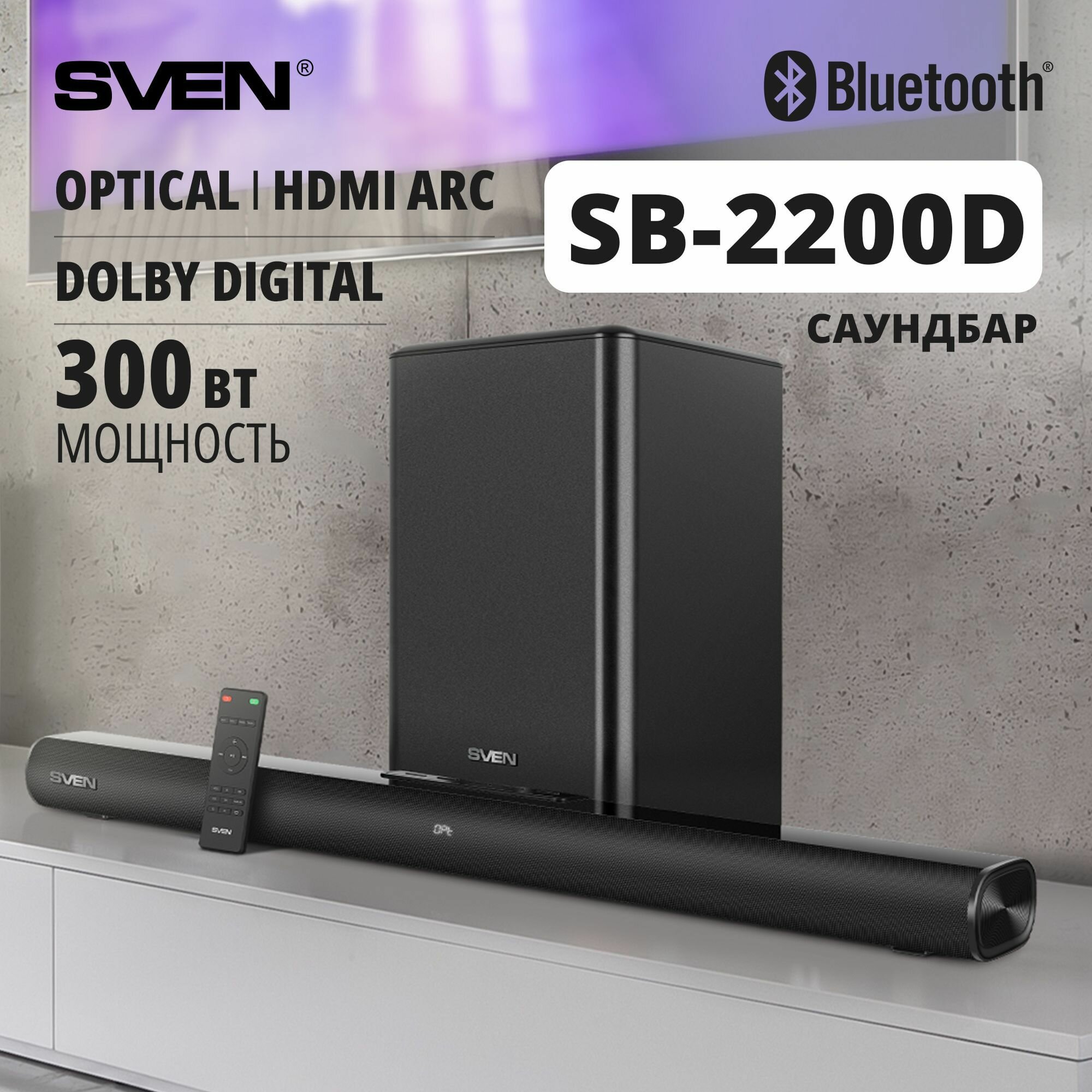 Саундбар Sven черный (300Вт DD BT HDMI ПДУ Optical USB дисплей беспроводной сабвуфер) SB-2200D