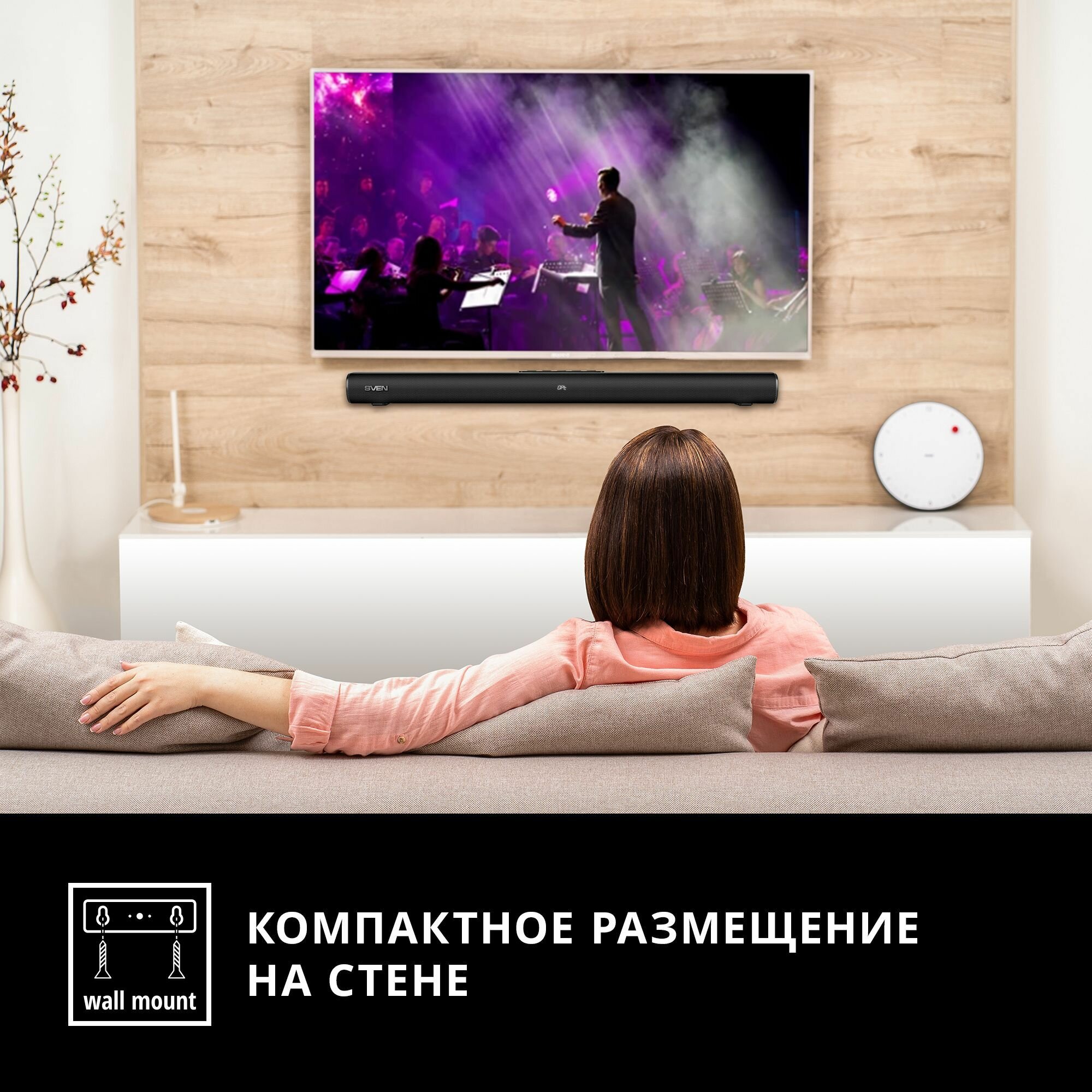 Подключение и подготовка комплекта к работе сделаны максимально легкими и простыми, а количество кабелей сведено к минимуму – даже сабвуфер подключается к головному устройству без проводов, что позволяет установить его более эффективно и лучше вписать в интерьер. Сам саундбар можно положить на полку или закрепить на стене с помощью специально предусмотренных креплений.