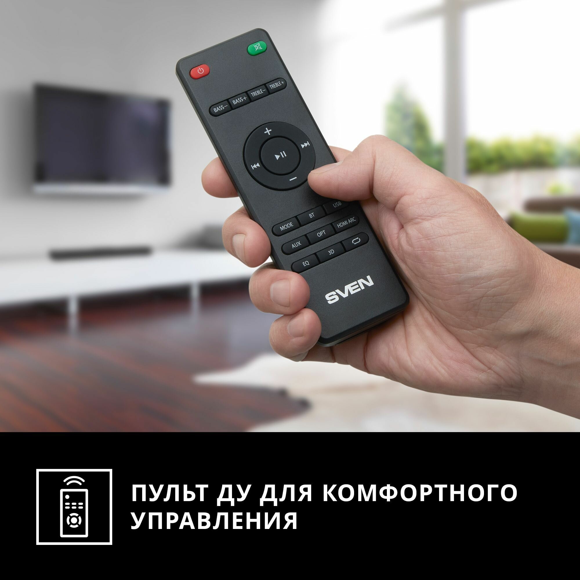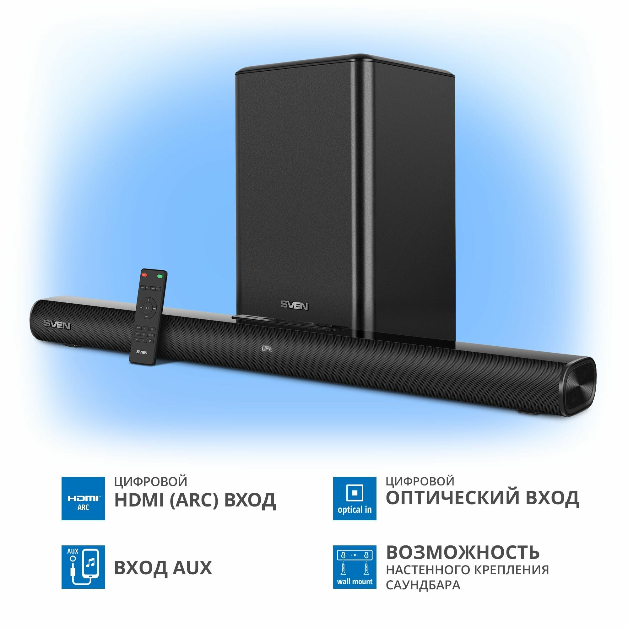Управление комплектом осуществляется с помощью отличного собственного пульта, но не только – благодаря поддержке технологии HDMI CEC включать и управлять громкостью саундбара SVEN можно прямо с пульта телевизора, что гораздо удобнее. Все данные о работе устройства отображаются на информативном LED-дисплее, немного подстроить звук под себя можно с помощью встроенного эквалайзера – видно, что разработчики устройства действительно позаботились о комфорте его использования. Сохранив при этом его стоимость сравнительно невысокой, в чем уже можно убедиться лично – продажи модели в магазинах бытовой техники и электроники стартовали.