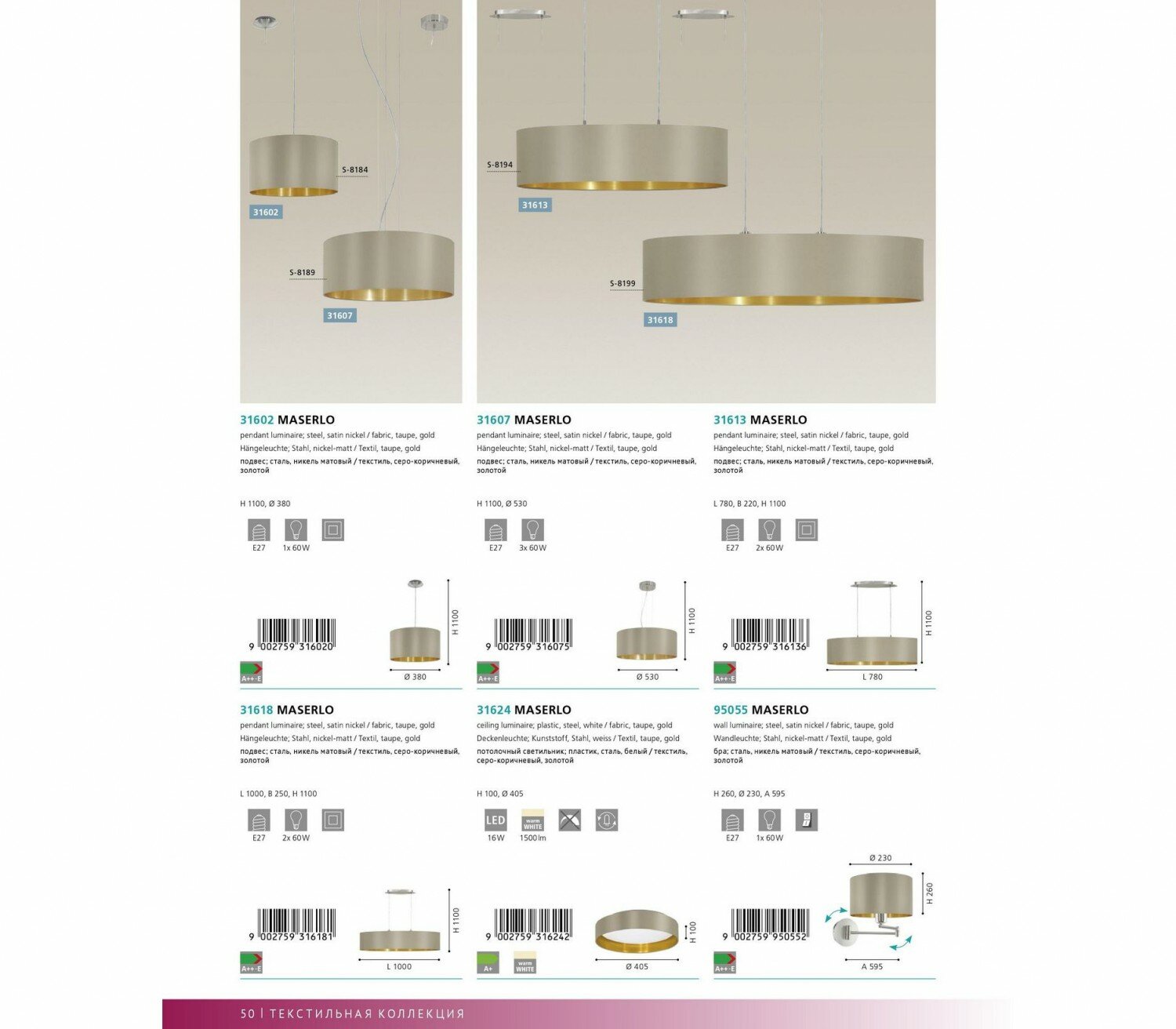 Подвес MASERLO, 1х60Вт (E27), диаметр - 380, никель матовый/текстиль, серо-коричневый, золотой - сочетание простой классики с теплотой уюта. Ткани натуральных цветов и понятный дизайн создаст приятную и теплую атмосферу в доме.