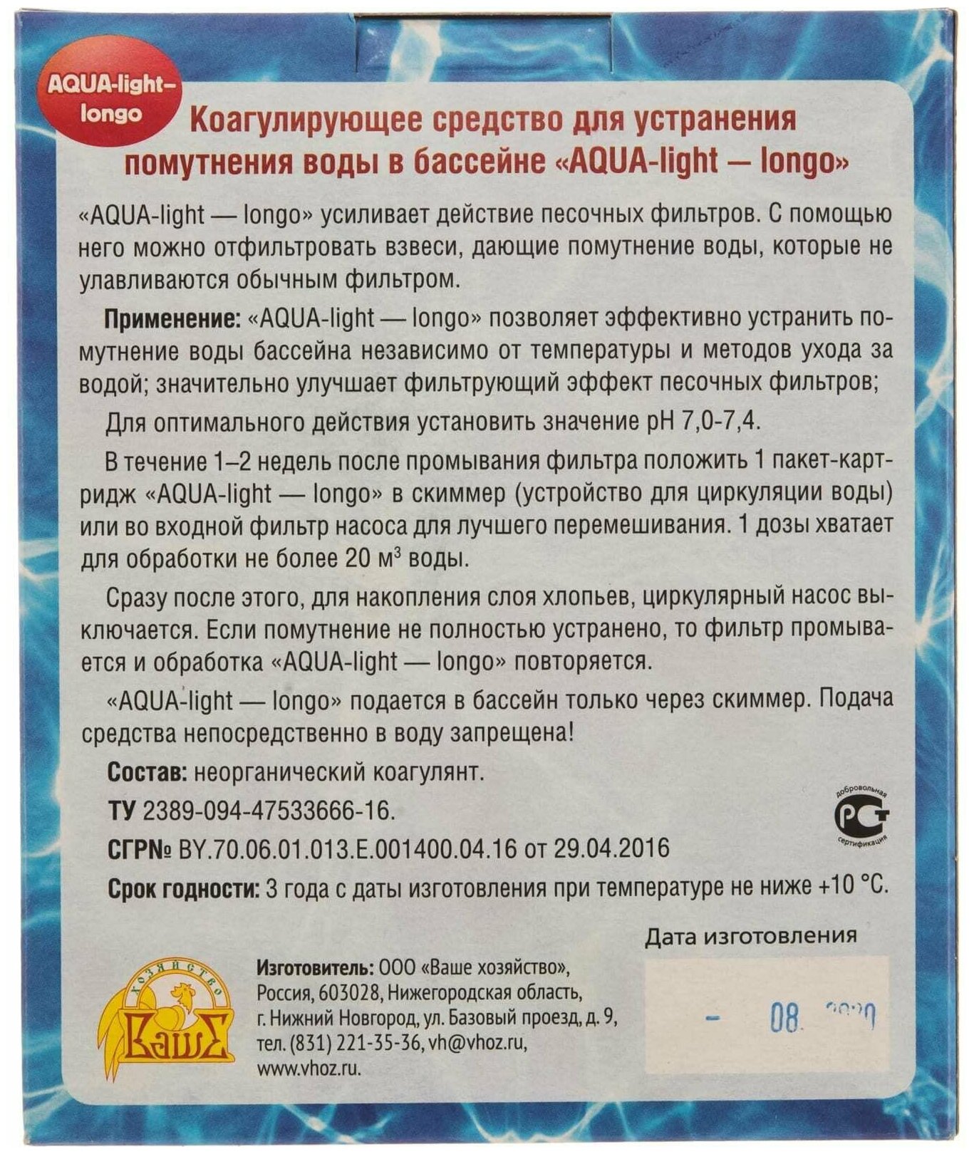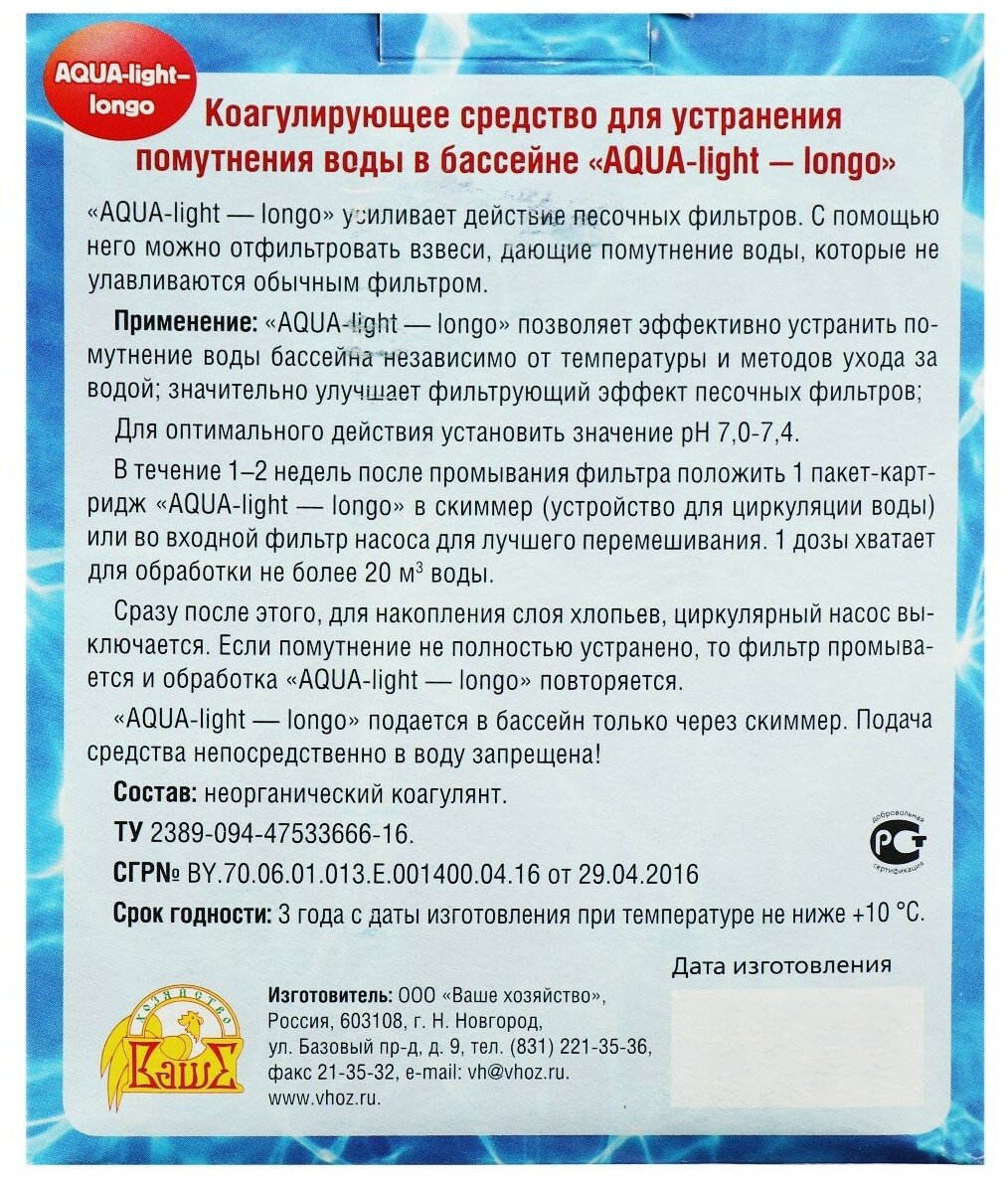 | Способ применения | В течение 1-2 недель после промывания фильтра положить 1 пакет-картридж ''AQUA-light-longo'' в скиммер (устройство для циркуляции воды) или во входной фильтр насоса для лучшего перемешивания. 1 дозы хватает для обработки не более 20 кубических метров воды |