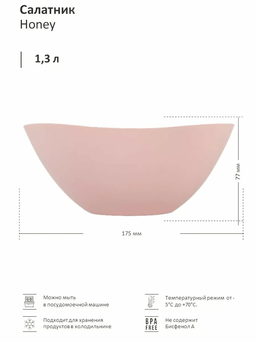 Простая форма, плавность линий и легкость основные черты салатника Honey. Закругленные края придают стильный и привлекательный внешний вид. Он послужит украшением стола как самостоятельный элемент сервировки или как дополнение к уже существующим сервизам. Салатник подходит как для дома, так и для выездов на природу, его удобно брать с собой. Объем салатника 1,3л оптимален и подойдёт как для приготовления на одну персону, так и для нескольких человек. Размер: 17,5х17,5х7,7см. Температурный режим: от -5С до +70С.