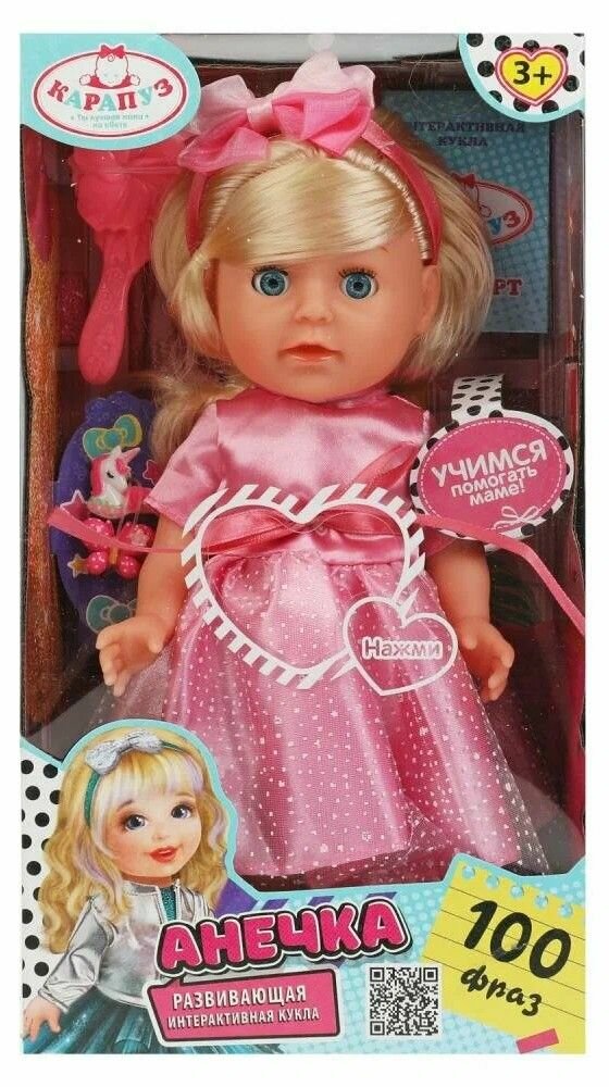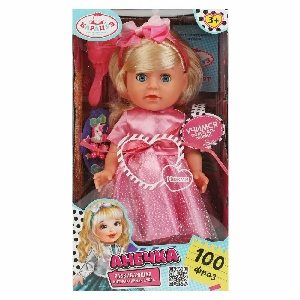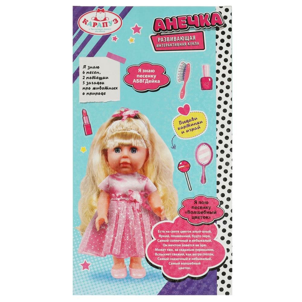 Развивающая интерактивная кукла ТМ Карапуз станет прекрасным подарком для вашей маленькой принцессы: поёт 2 песни, рассказывает 3 стихотворения, знает 2 скороговорки, загадывает 2 загадки, говорит разные фразы, вместе учим вежливые слова, учимся быть аккуратным, учимся помогать маме, закрывает глазки. В комплекте: расчёска, 2 заколки. Милая кукла с детально проработанным личиком обязательно понравится малышке. Анечка одета в нарядное розовое платье. Одежда легко снимается и надевается. У куклы длинные красивые волосы. Хозяйка куколки легко сможет сделать Анечке причёску по своему желанию, для этого в наборе имеется расчёска и заколки. Игра с интерактивными куклами учит ребёнка заботиться об окружающих, быть ответственным и внимательным, а также развивает: воображение, память, звуковое восприятие и музыкальный слух, социально-коммуникативные навыки. Рост куклы: 25 см. Работает от 2-х батареек типа LR44 (в комплекте). Рекомендовано детям от 3-х лет.
