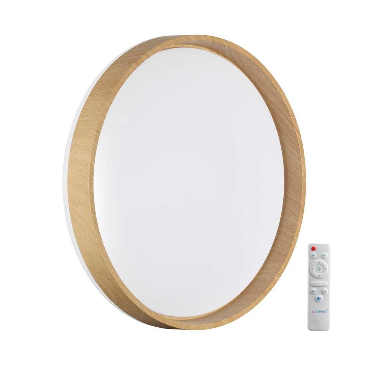 Светильник линии GARI WOOD состоит из металлического основания (базы) и пластикового рассеивателя. Материал рассеивателя - высококачественный пластик марки PMMA 2.0 белого цвета с матовой поверхностью, обеспечивающий светильнику равномерное рассеивание и хорошее светопропускание. Форма плафона: круглая, декорирована ободом "под дерево" из пластика коричневого цвета. В основание обода со стороны потолка добавлена вставка из светопропускающего пластика, благодаря которой потолок красиво подсвечивается. Степень защиты IP43 позволяет использовать светильник в определенных зонах влажных помещений. В комплект входит заменяемый LED модуль с линзами, мощностью 70Вт, которая соответствует лампе накаливания 610Вт. А также пульт ДУ (с креплением на стену), с помощью которого осуществляется плавное изменение цветовой температуры 3000-6000К, изменение яркости, переход в режим переключения теплого/белого/холодного/ночного света. Светильник имеет функцию "память".