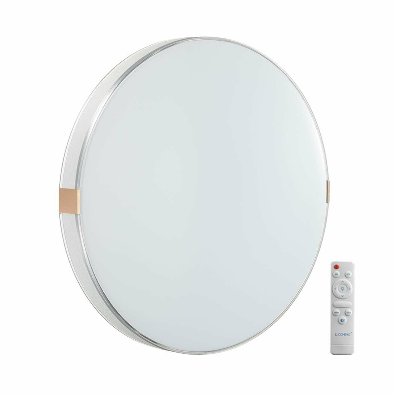 Светильник линии OTIGA WHITE состоит из металлического основания (базы) и пластикового рассеивателя. Материал рассеивателя - высококачественный пластик марки PMMA 2.0 белого цвета с матовой поверхностью, без текстуры. Пластик обеспечивает светильнику равномерное рассеивание и хорошее светопропускание. Форма плафона: круглая, с ободом из прозрачного пластика, декорированного эко кожей белого цвета. Обод украшен металлическими клипсами, цвет золото. Степень защиты IP43 позволяет использовать светильник в определенных зонах влажных помещений. В комплект входит заменяемый LED модуль с линзами, мощностью 70Вт, которая соответствует лампе накаливания 610Вт. А также пульт ДУ (с креплением на стену), с помощью которого осуществляется плавное изменение цветовой температуры 3000-6000К, изменение яркости, переход в режим переключения теплого/белого/холодного/ночного света. Светильник имеет функцию "память".