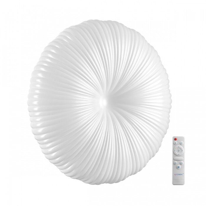 Светильник линии ANIX состоит из металлического основания (базы) и пластикового рассеивателя. Материал рассеивателя - высококачественный пластик марки PMMA 2.0 белого цвета с матовой поверхностью. Пластик обеспечивает светильнику равномерное рассеивание и хорошее светопропускание. Форма плафона: круглая, декорирована рельефом из пластика в виде узора белого цвета. Степень защиты IP43 позволяет использовать светильник в определенных зонах влажных помещений. В комплект входит заменяемый LED модуль с линзами, мощностью 70Вт, которая соответствует лампе накаливания 610Вт. А также пульт ДУ (с креплением на стену), с помощью которого осуществляется плавное изменение цветовой температуры 3000-6000К, изменение яркости, переход в режим переключения теплого/белого/холодного/ночного света. Светильник имеет функцию "память".