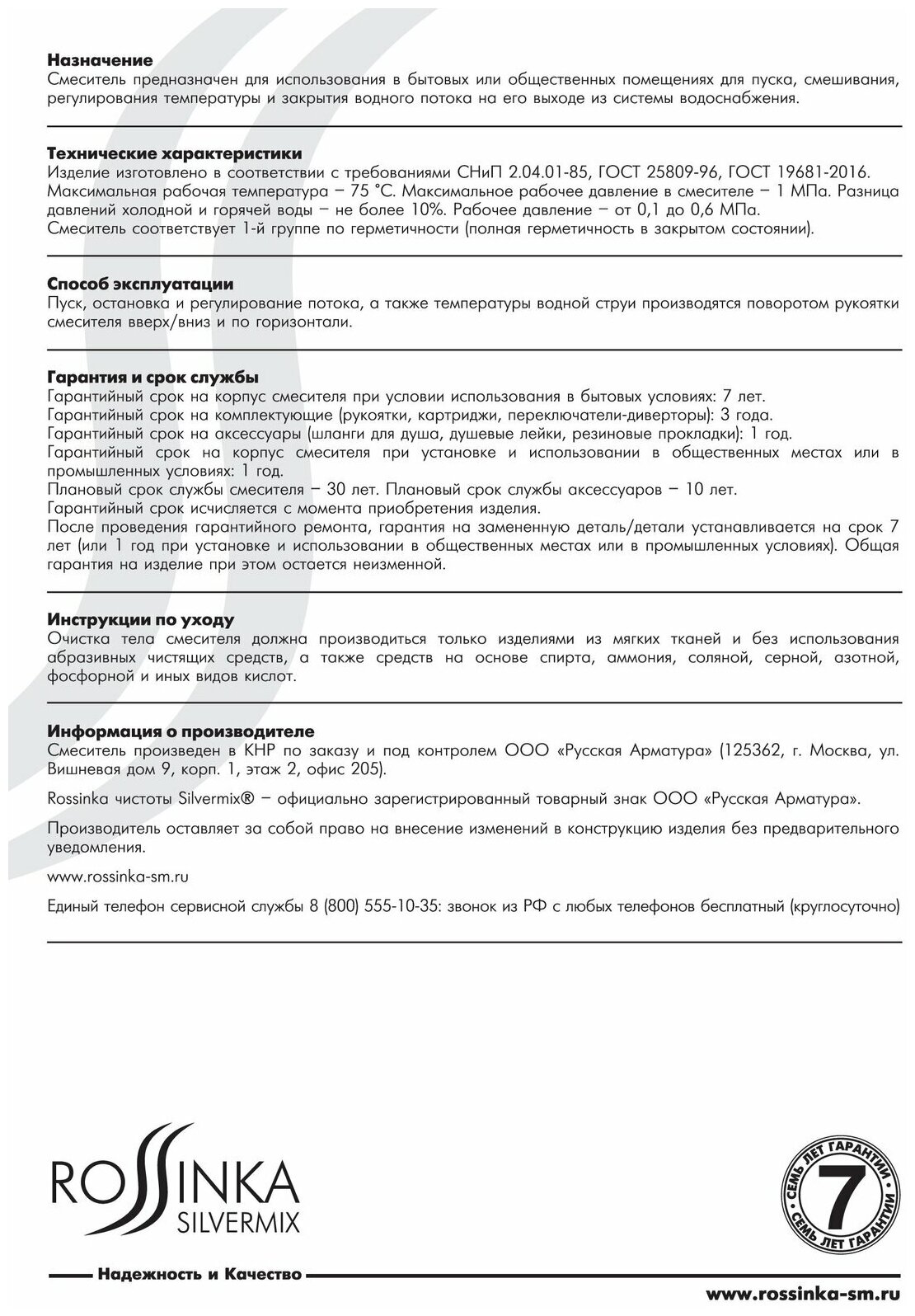 | Гарантийный срок | 7 лет |