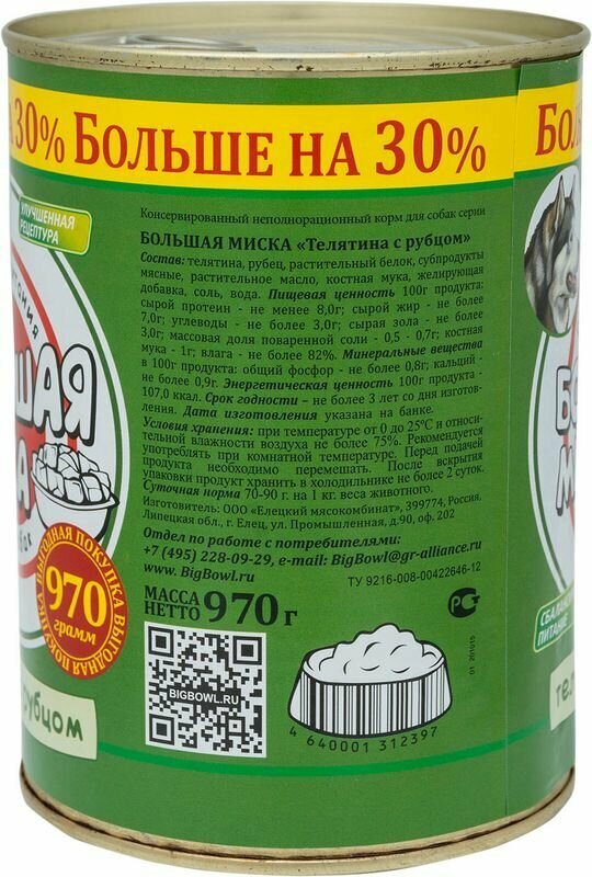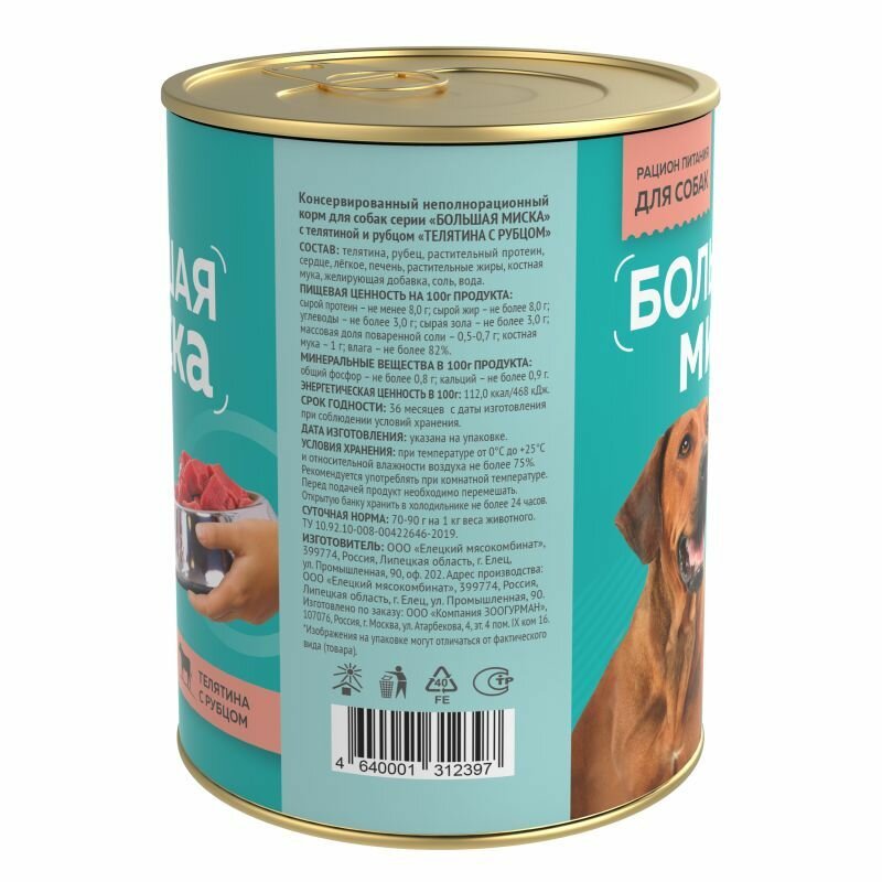 Корм для собак "Большая миска" Телятина с рубцом 970г Утконос