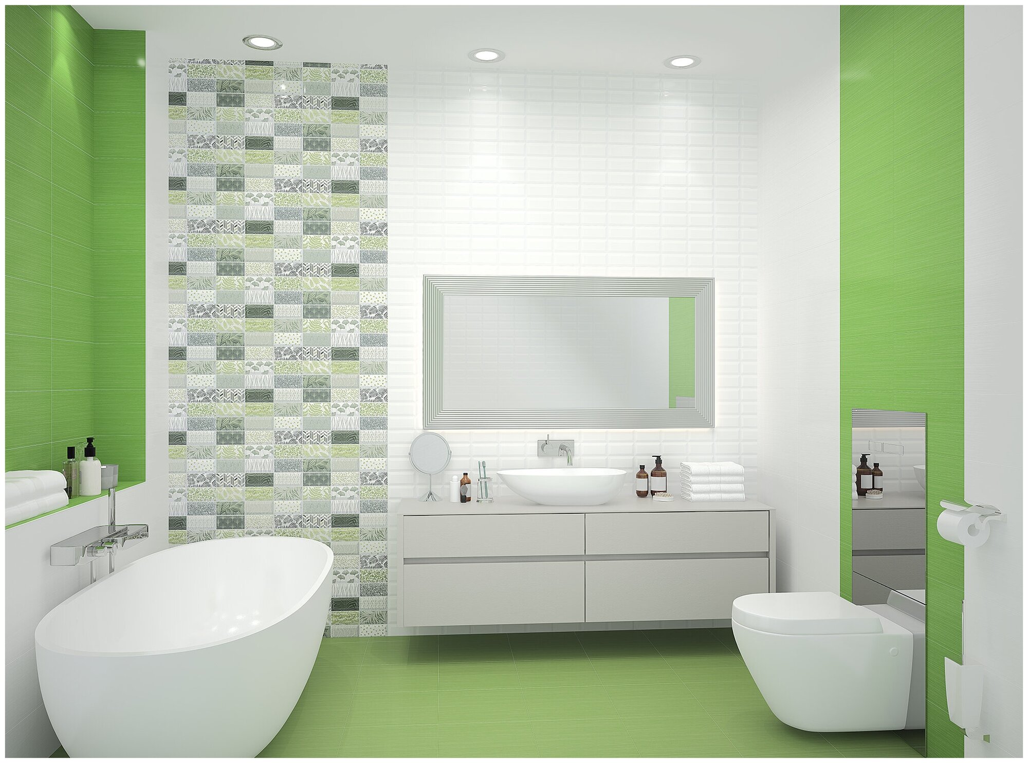 Ярким дополнением к основным настенным и напольным элементам станут декоративная вставка и панно с изображением сочных зеленых стеблей и белоснежных бутонов прелестных тюльпанов, гармонично вписываясь в общую композицию белого и зеленого цветов, выгодно выделяя облик вашего интерьера среди обыденных дизайнерских решений. Невысокая стоимость коллекции позволит использовать ее даже в проектах со скромным бюджетом и станет поистине приятным сюрпризом для своего обладателя.
