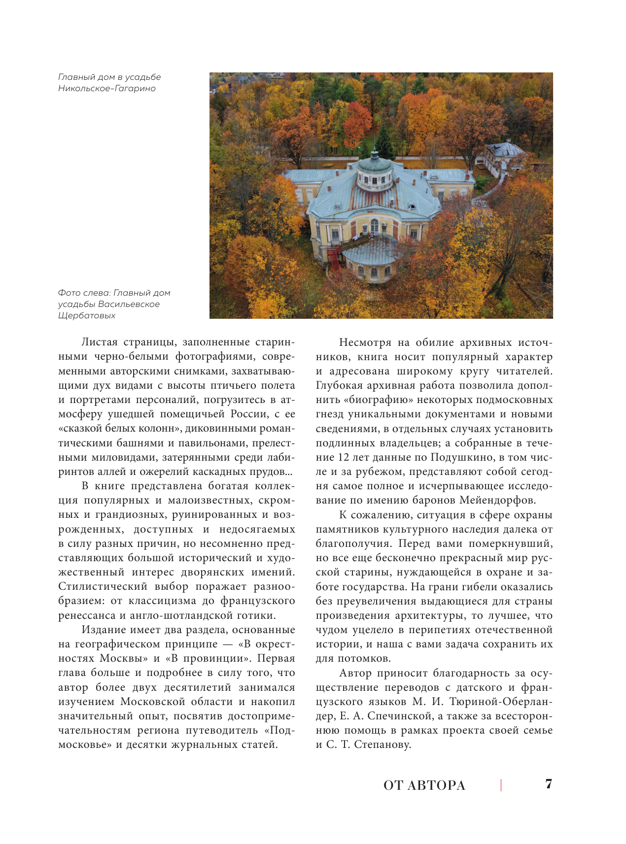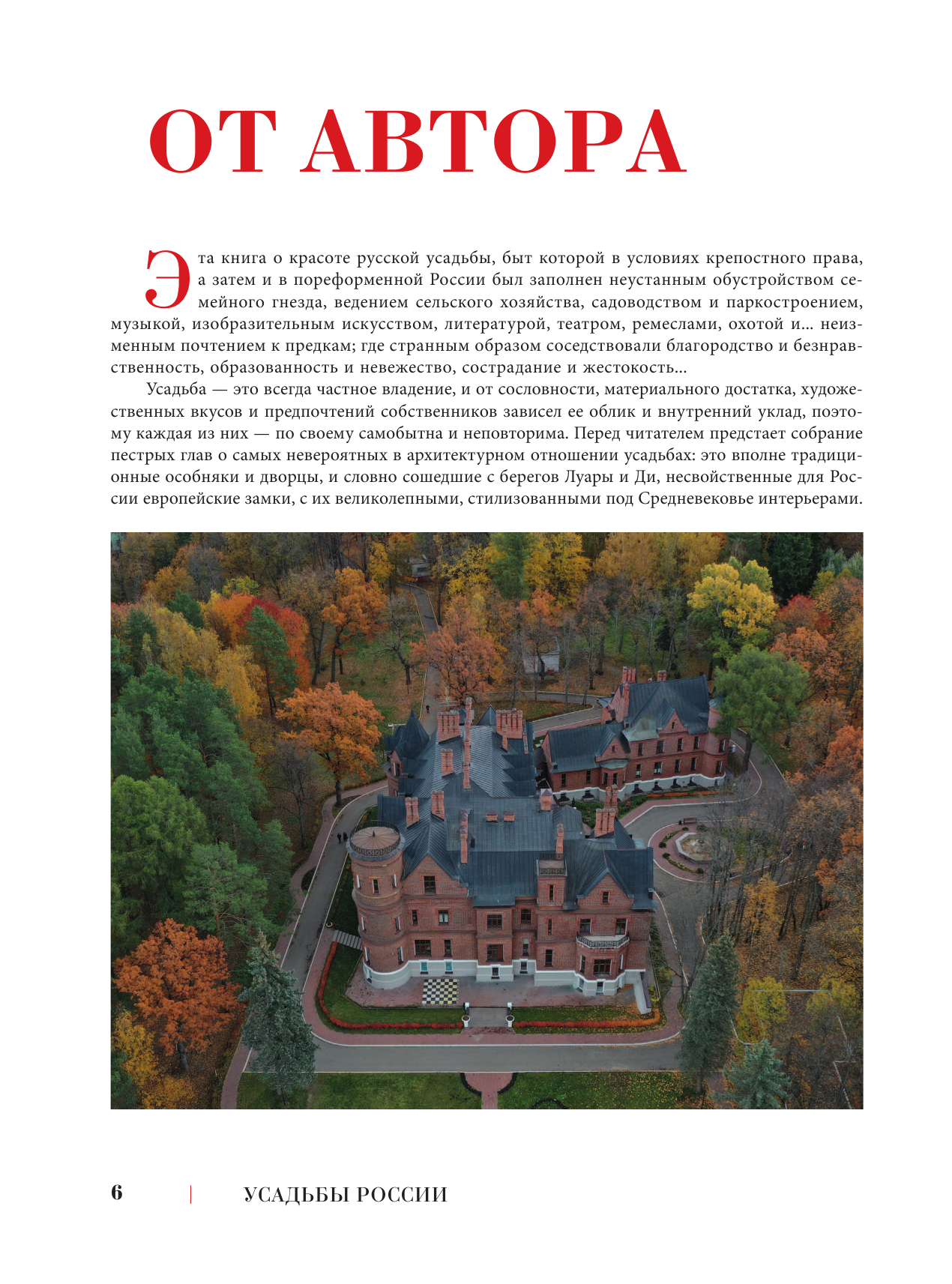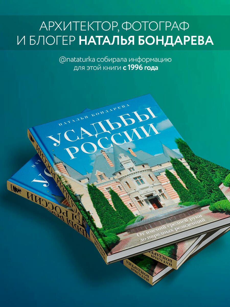 "Усадьбы России" - это издание, посвященное архитектурному и культурному наследию нашей страны. Автор книги Наталья Бондарева увлекательно повествует об истории как популярных, так и малоизвестных дворянских гнезд, расположенных в Подмосковье и других регионах Центральной России. Издание богато иллюстрировано авторскими снимками и старинными фотографиями из музейных и архивных коллекций. Многие сведения, документы и изображения публикуются впервые.