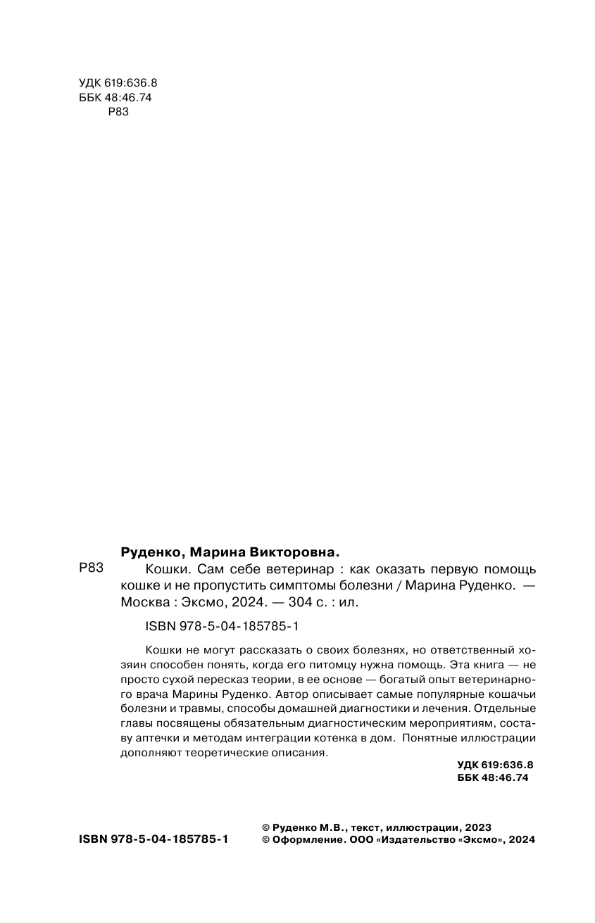 Кошки. Сам себе ветеринар. Как оказать первую помощь кошке и не пропустить симптомы болезни (Руденко Марина Викторовна); ООО "Издательство "Эксмо", 2024
