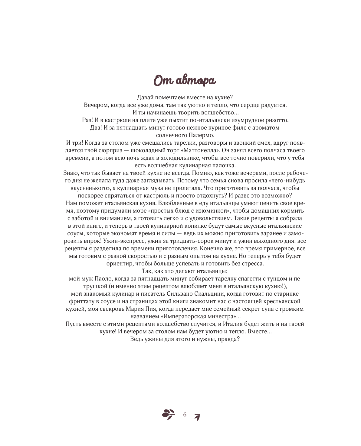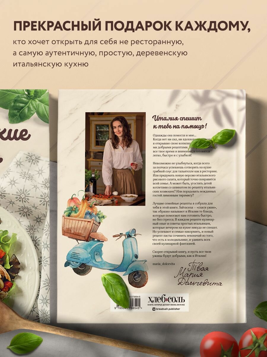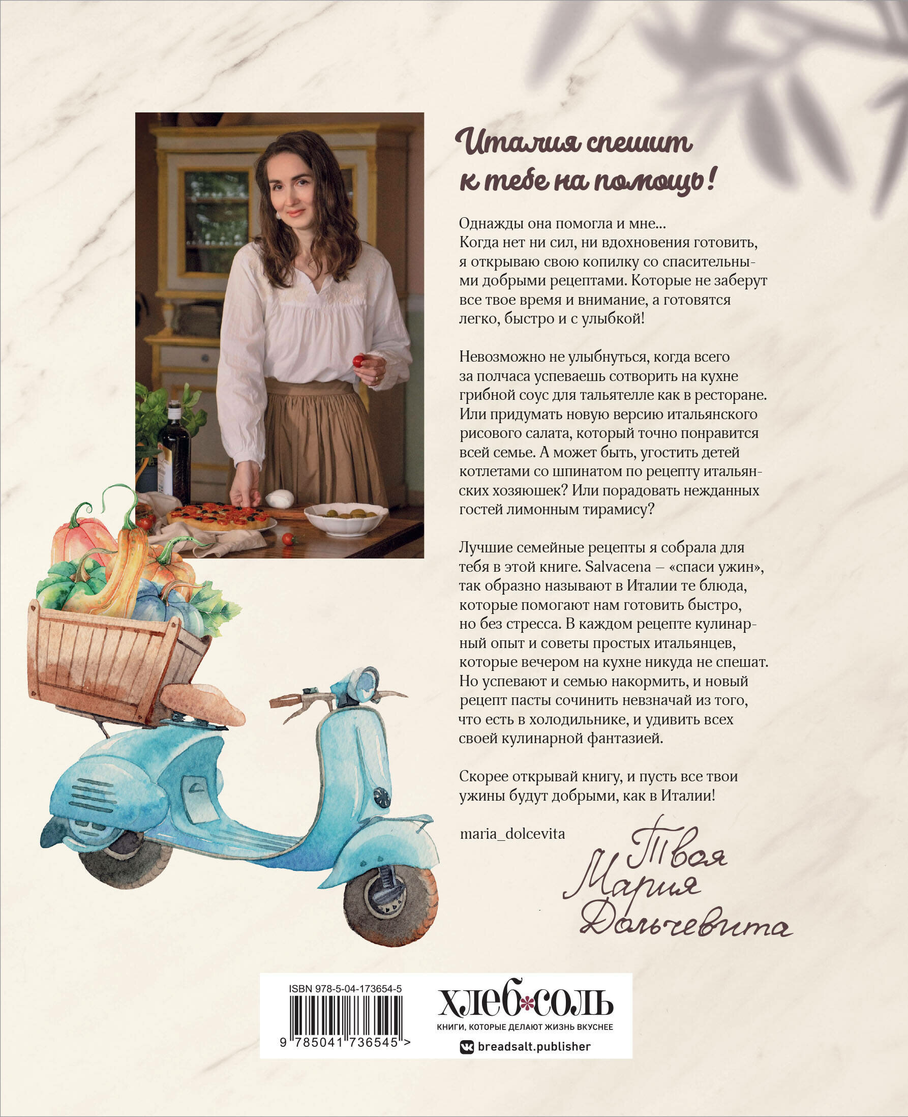 Лучшие семейные рецепты я собрала для тебя в этой книге. Salvacena — «спаси ужин», так образно называют в Италии те блюда, которые помогают нам готовить быстро, но без стресса. В каждом рецепте кулинарный опыт и советы простых итальянцев, которые вечером на кухне никуда не спешат. Но успевают и семью накормить, и новый рецепт пасты сочинить невзначай из того, что есть в холодильнике, и удивить всех своей кулинарной фантазией.