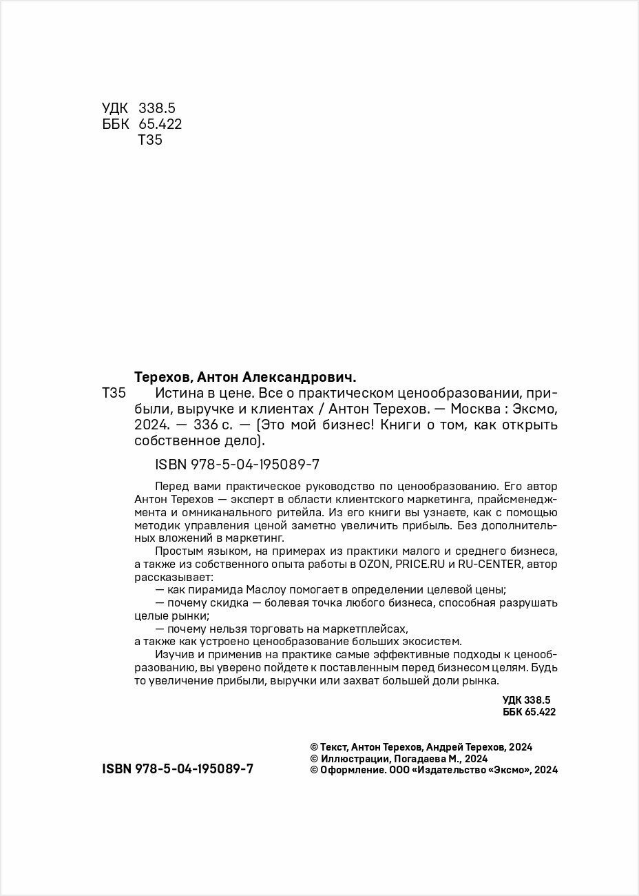 Истина в цене. Все о практическом ценообразовании прибыли выручке и клиентах (Терехов Антон Александрович); ООО "Издательство "Эксмо", 2023