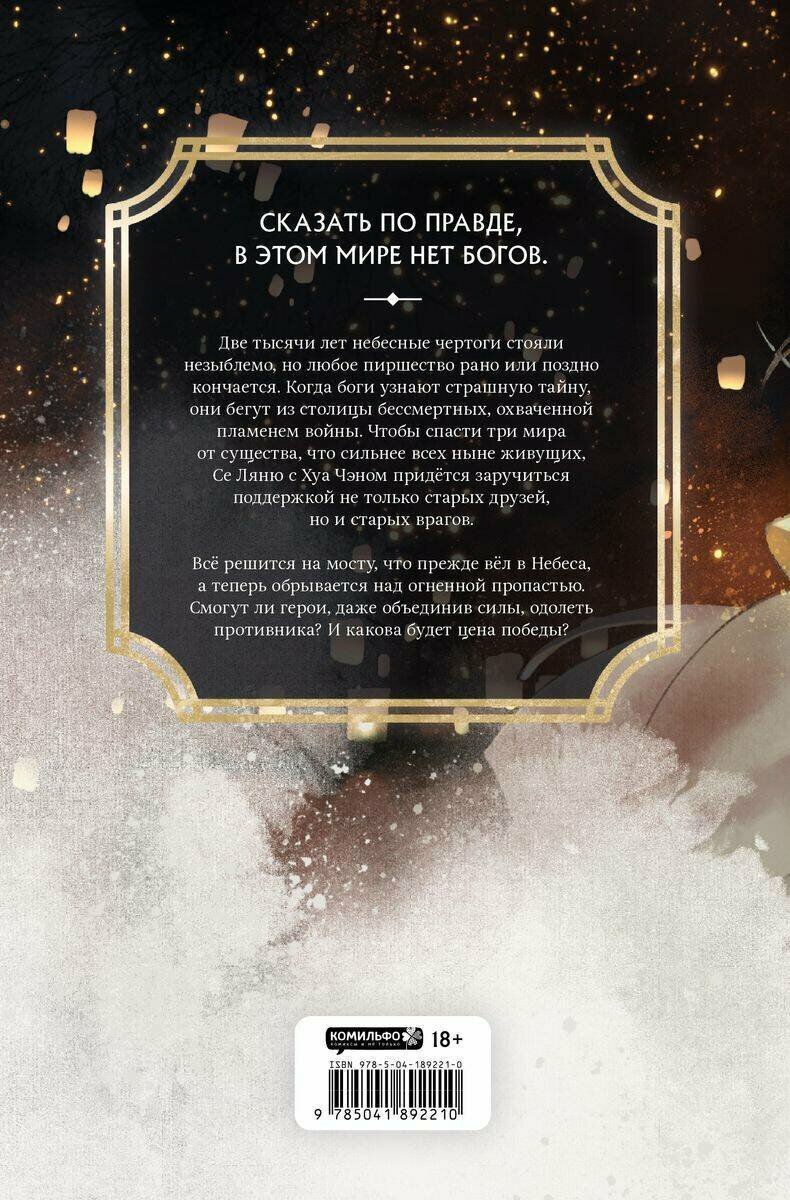 Две тысячи лет небесные чертоги стояли незыблемо, но любое пиршество рано или поздно кончается. Когда боги узнают страшную тайну, они бегут из столицы бессмертных, охваченной пламенем войны. Чтобы спасти три мира от существа, что сильнее всех ныне живущих, Се Ляню с Хуа Чэном придётся заручиться поддержкой не только старых друзей, но и старых врагов.
