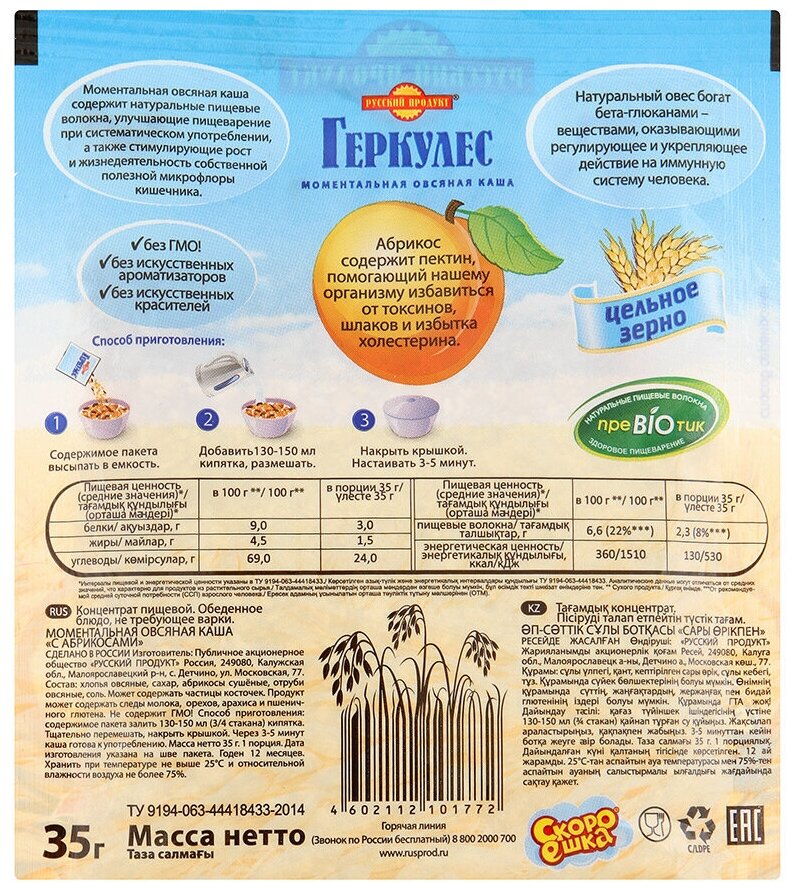 | Состав | Хлопья овсяные, сахар, абрикосы сушеные, отруби овсяные, соль. Может содержать частицы косточек. Продукт может содержать следы молока, орехов, арахиса и пшеничного глютена. Не содержит ГМО. |