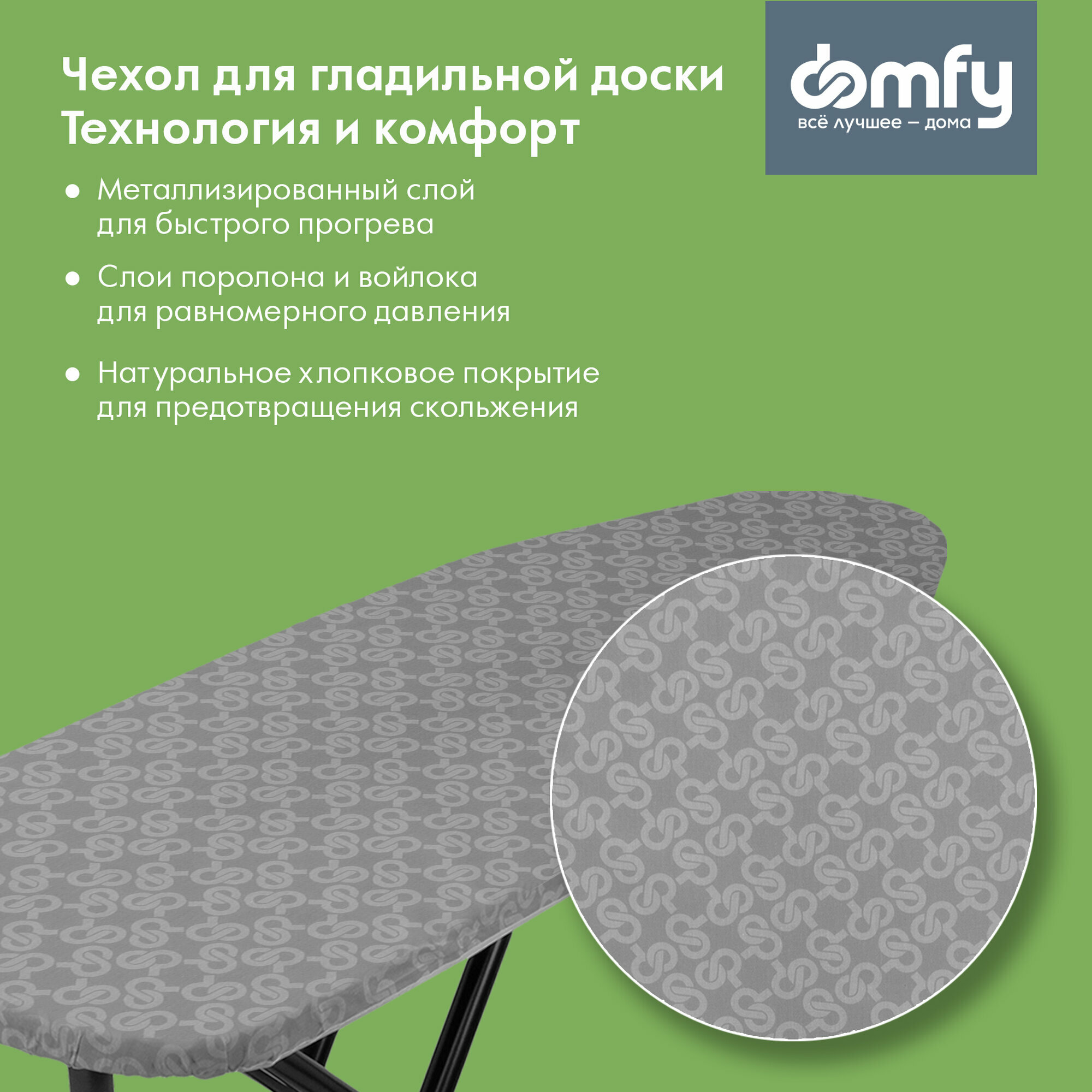 Чехол для гладильной доски с эффектом двусторонней глажки Domfy Чехол для гладильной доски с эффектом двусторонней глажки Domfy существенно упрощает и ускоряет процесс разглаживания даже плотных тканей и изделий из них. Покрытие имеет многослойную структуру и размер 132х48 см. Эффект двусторонней глажки. Металлизированный слой обеспечивает одновременный прогрев ткани с обеих сторон для более быстрого и эффективного разглаживания.Мягкая поверхность. Слои поролона и войлока толщиной 2 мм каждый равномерно распределяют давление на ткань и предотвращают образование новых складок.Покрытие из 100% хлопка. Натуральное хлопковое покрытие впитывает лишнюю влагу и препятствует соскальзыванию материала с поверхности.Для досок 122х38. Чехол оптимально подходит для гладильных досок с размером платформы 122х38.Надежная фиксация. Использование креплений препятствует смещению покрытия относительно платформы и образованию складок.Чехол для гладильной доски Domfy существенно расширит её возможности за счет эффекта двусторонней глажки. Наличие мягкой подкладки способствует равномерному распределению усилия, создаваемого подошвой утюга, а покрытие из натурального хлопка позволяет избежать образования пятен и скольжения ткани по поверхности.