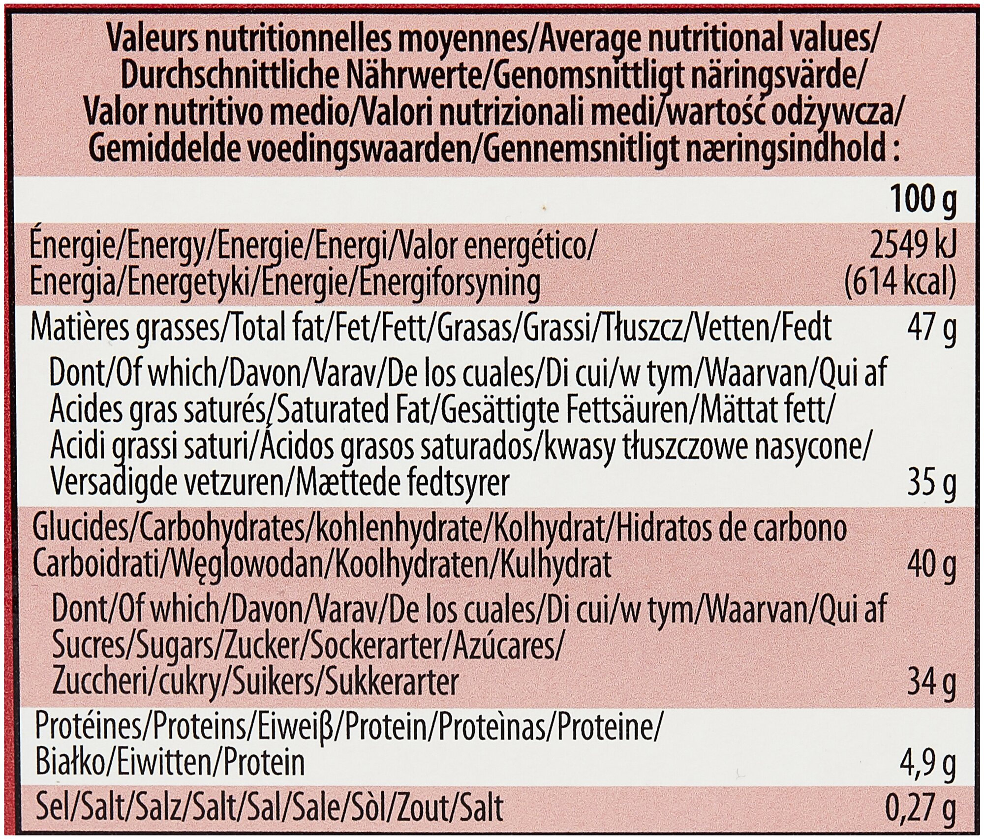 | Состав | не гидрогенизированные растительные жиры (пальмовое/ пальмовых ядер), сахар, обезжиренное масло какао, порошок сыворотки, какао-порошок (1%), эмульгатор |