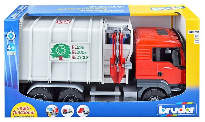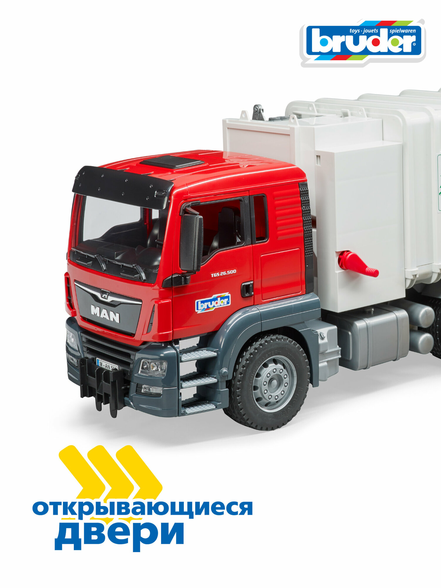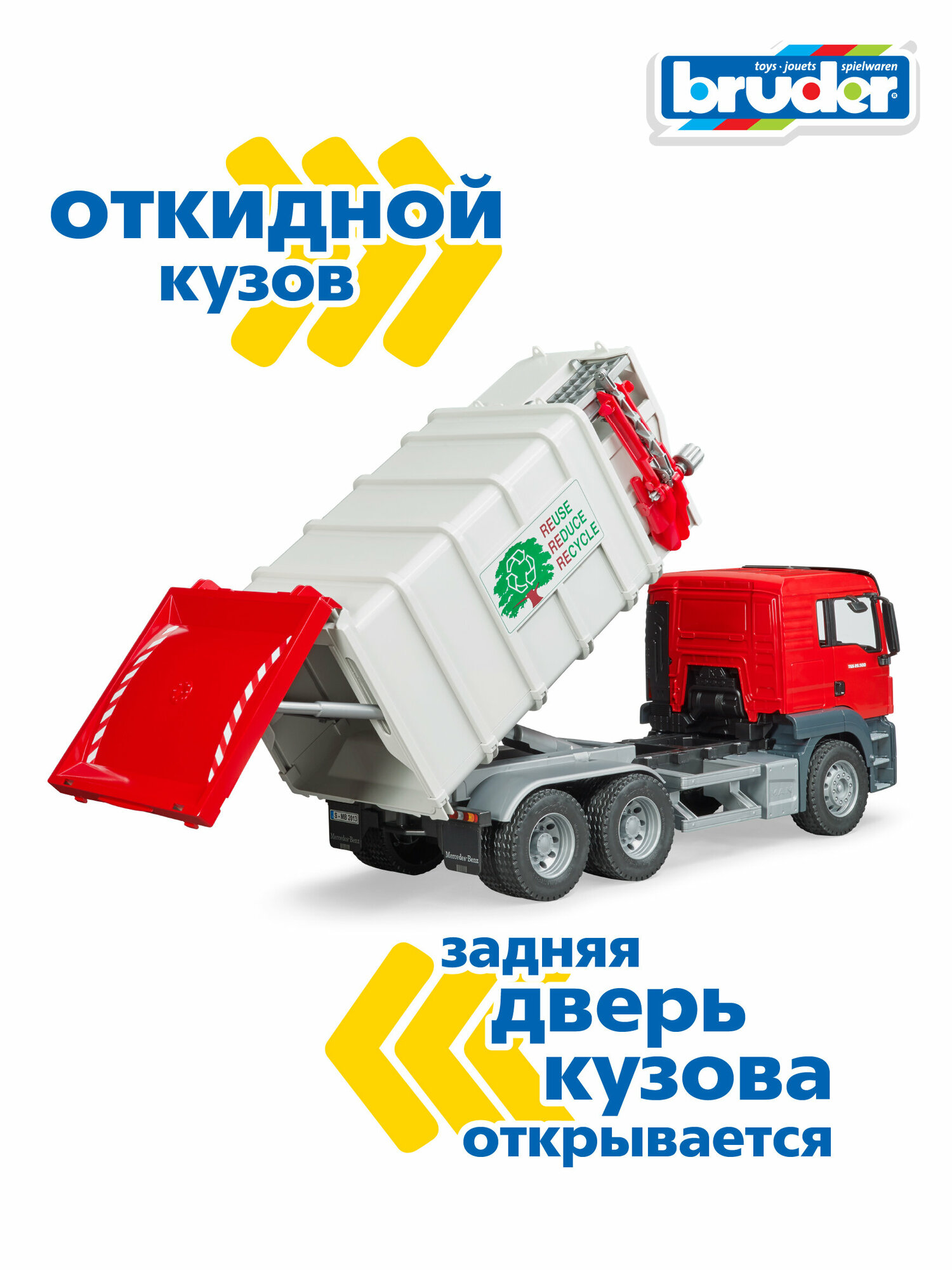Мусоровоз MAN с задней загрузкой Bruder 03760 машина выкрашена в яркий оранжевый цвет, с прозрачными стеклами, складными зеркалами заднего вида, салон кабины детализирован и двери открываютя, в качестве водителя в нее можно усадить фигурку человечка из серии bWorld (в комплект не входит). Дополнен двумя мусорными баками для отходов; возможность высыпать отходы из мусорного бака в кузов; механизм с вращающейся ручкой для уплотнения мусора в кузове; багажник открывается и фиксируется для освобождения от отходов. Ездит мусоровоз на больших колесах плавно благодаря мягким резиновым покрышкам с протектором.