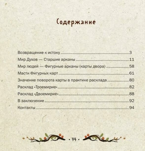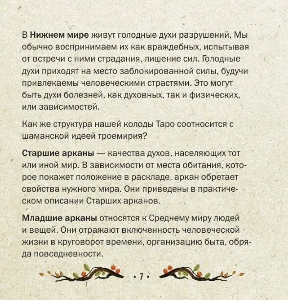 Колода снабжена полноцветным руководством, описывающим особенности и структуру колоды, концепцию трех миров в шаманизме и значения всех кар. Описание каждого Старшего аркана состоит из трех частей: ключевое значение, значение в трех мирах и современное толкование. В заключительной части руководства - расклады, созданные специально для «Таро шаманского мира».