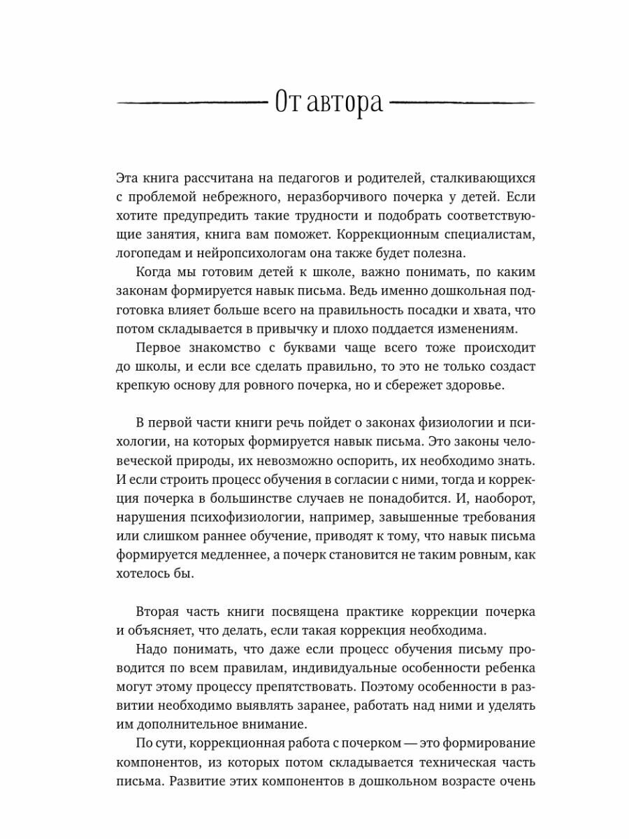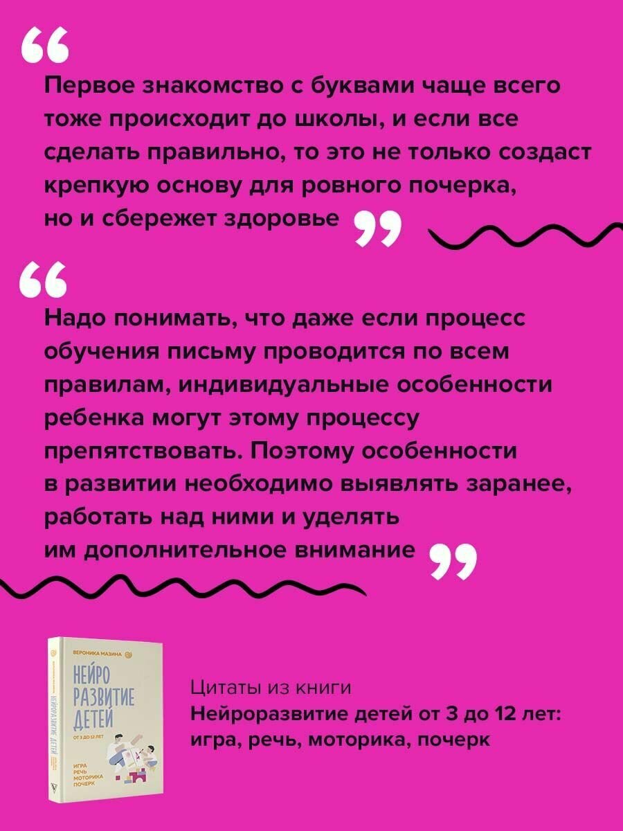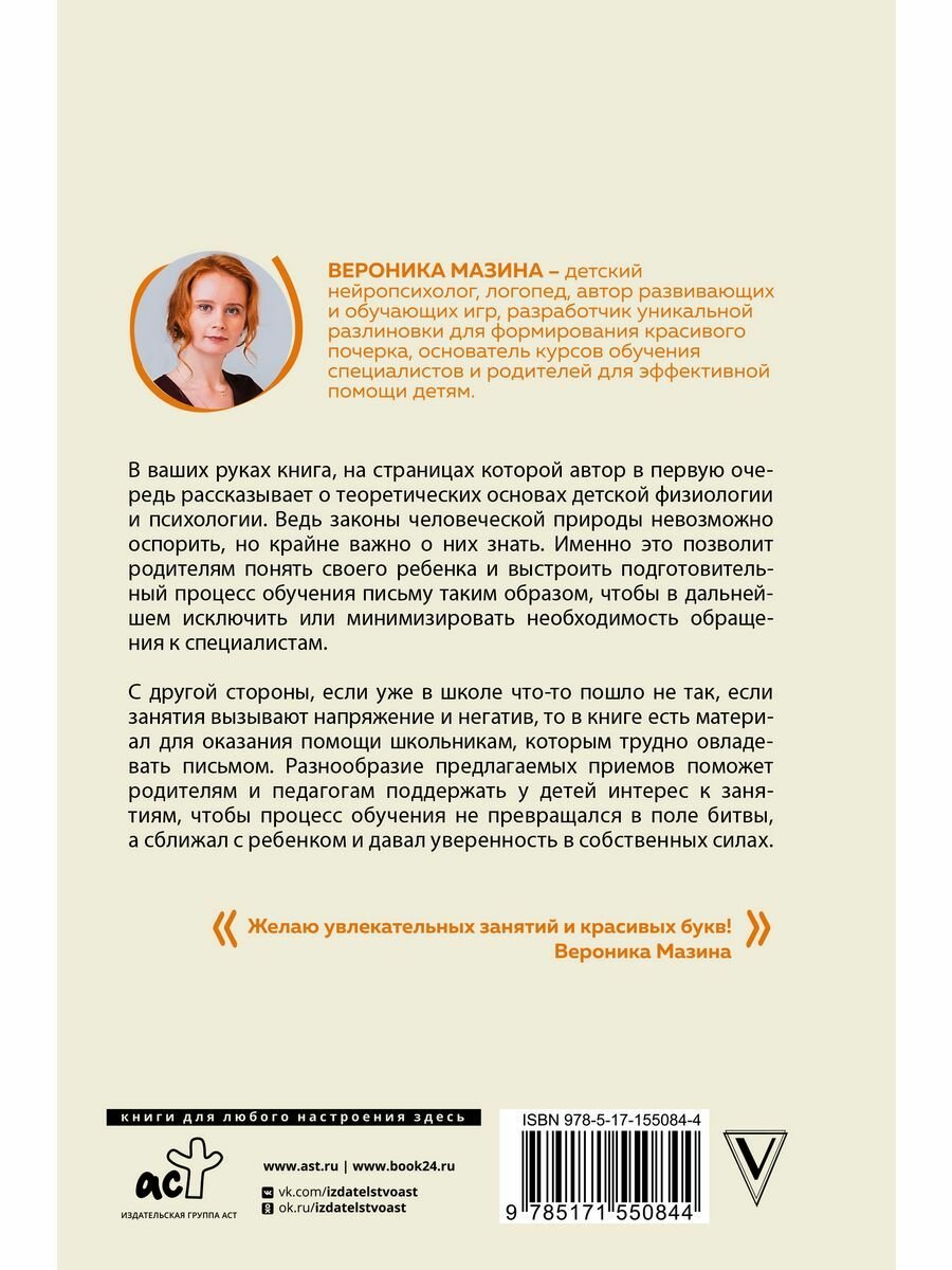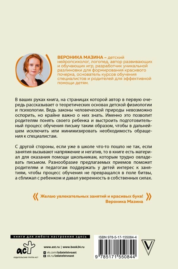 Вероника Мазина – детский нейропсихолог, логопед, автор развивающих и обучающих игр, разработчик уникальной разлиновки для формирования красивого почерка, основатель курсов обучения специалистов и родителей для эффективной помощи детям. В ваших руках книга “ Нейроразвитие детей от 3 до 12 лет: игра, речь, моторика, почерк”, на страницах которой автор в первую очередь рассказывает о теоретических основах детской физиологии и психологии. Ведь законы человеческой природы невозможно оспорить, но крайне важно о них знать. Именно это позволит родителям понять своего ребенка и выстроить подготовительный процесс обучения письму таким образом, чтобы в дальнейшем исключить или минимизировать необходимость обращения к специалистам. С другой стороны, если уже в школе что-то пошло не так, если занятия вызывают напряжение и негатив, то в книге есть материал для оказания помощи школьникам, которым трудно овладевать письмом. Разнообразие предлагаемых приемов поможет родителям и педагогам поддержать у детей интерес к занятиям, чтобы процесс обучения не превращался в поле битвы, а сближал вас с ребенком и давал уверенность в собственных силах.