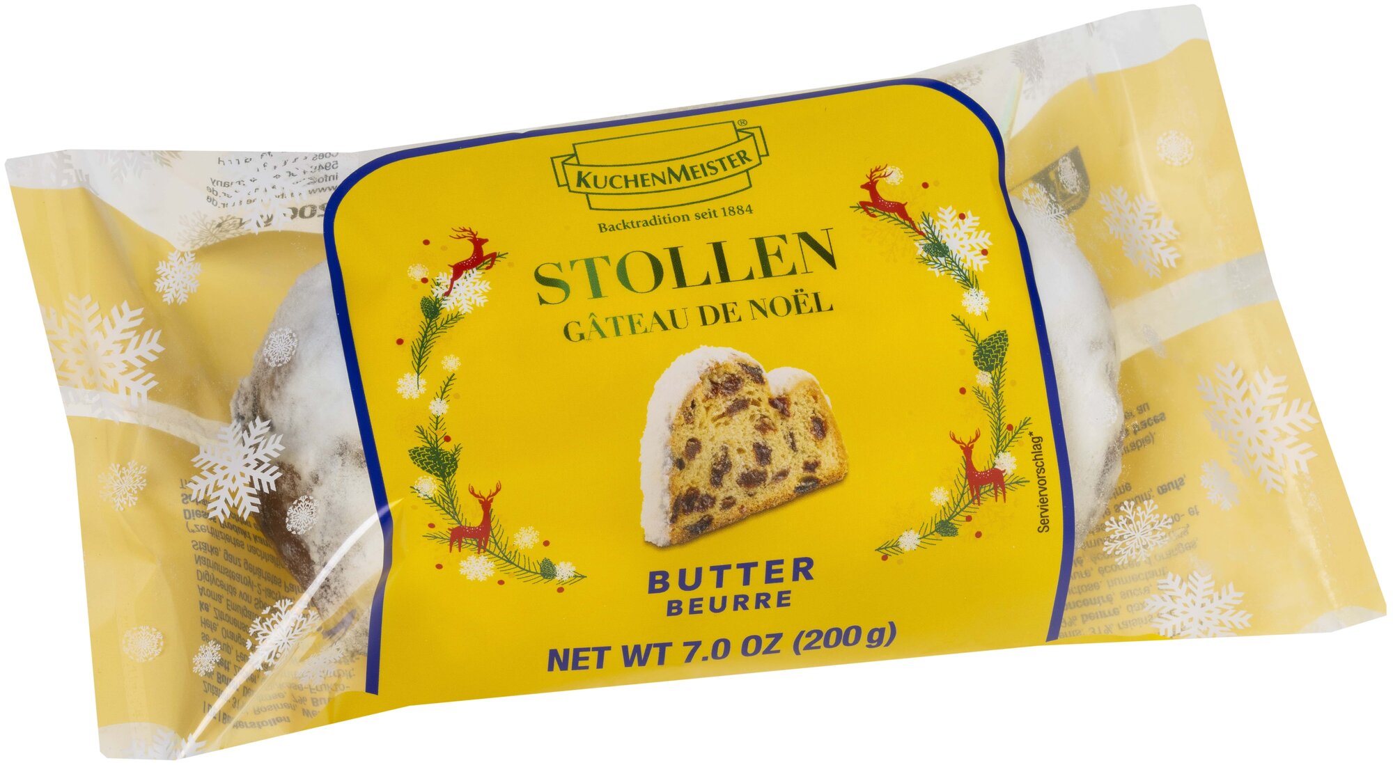 Попробуйте рождественский штоллен KuchenMeister - традиционный кекс с ароматной начинкой из изюма и цукатов из цитрусовых. Он обладает нежным сладким вкусом и приятной плотной текстурой благодаря выдержанному тесту, а аромат рождественского сезона передают особые специи. Сверху кекс обильно посыпан нежной и воздушной сахарной пудрой.