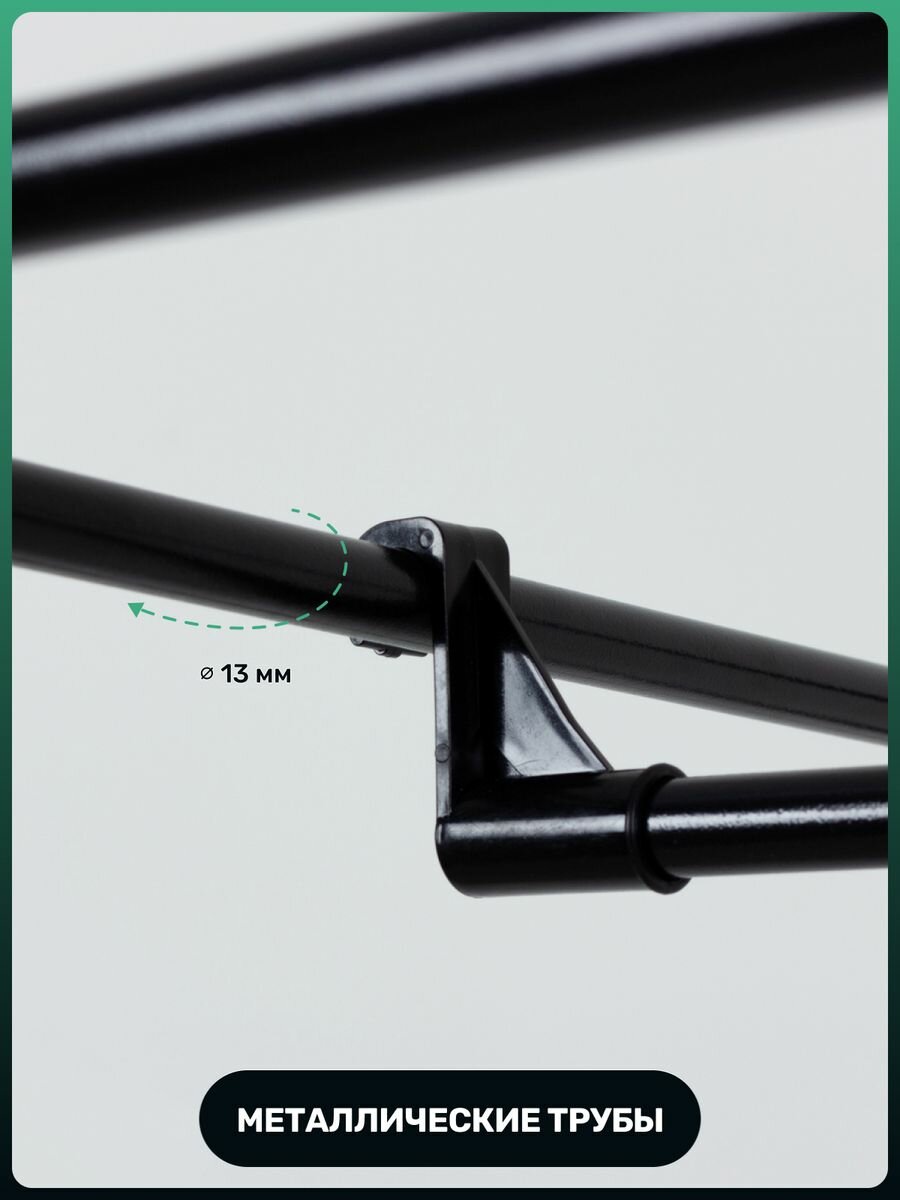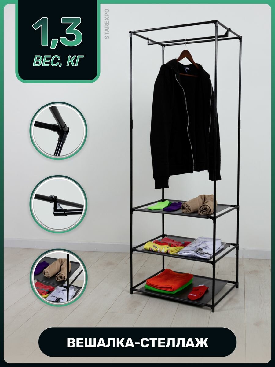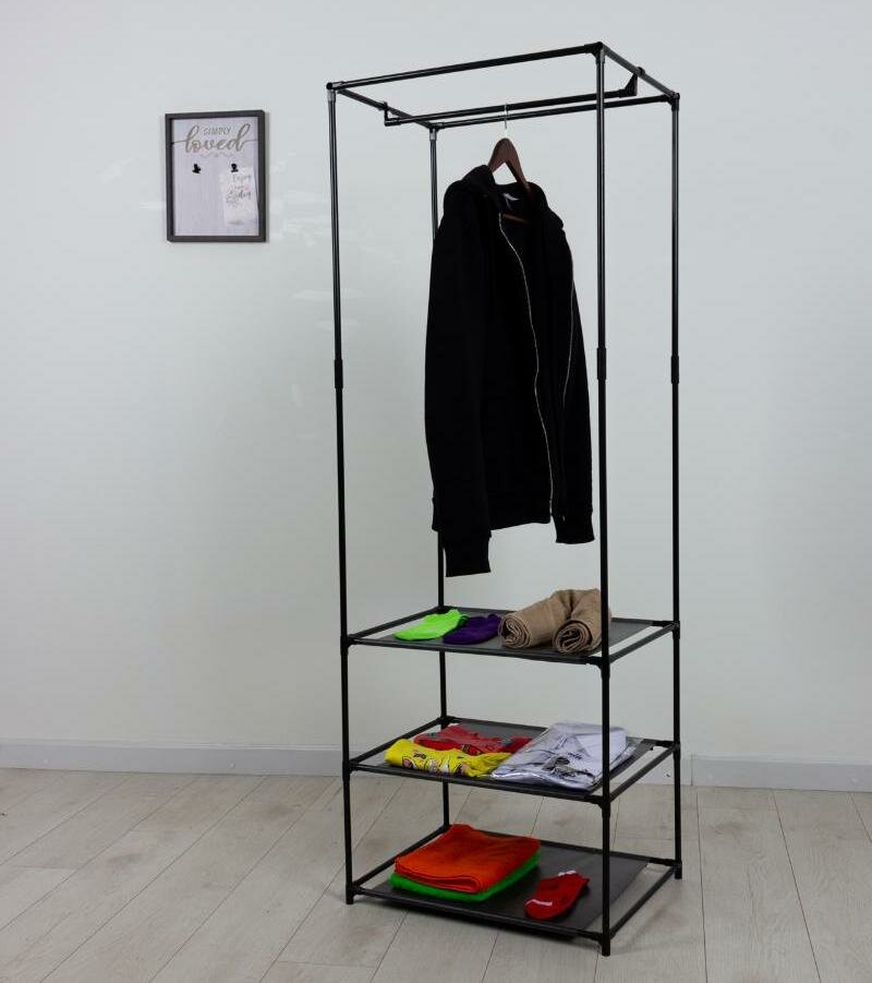 Вешалка-стеллаж напольная, с тремя полками для хранения вещей и перекладиной. Цвет: антрацит. Материал: металл с порошковым окрасом, нетканый материал. Диаметр труб - 13мм. Размер изделия в собранном виде 159,5х56х42см. Размер индивидуальной упаковки: 55х18х5см.