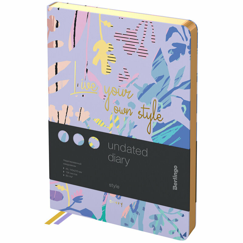 Недатированные ежедневники Berlingo "Style" в мягкой обложке из искусственной кожи с ярким дизайном. Фиолетовый цвет фона обложки. Фольгированные элементы дизайна на обложке. Золотой срез блока. Внутренний блок из 136 листов высококачественной кремовой бумаги повышенной плотности 80 г/м, пантонная печать в 2 краски, справочный материал и перфорированные уголки. Две закладки-ляссе. Отрывные заметки, бланки извещения о ДТП и справочные материалы. 3 комплекта стикеров станут приятным подарком.