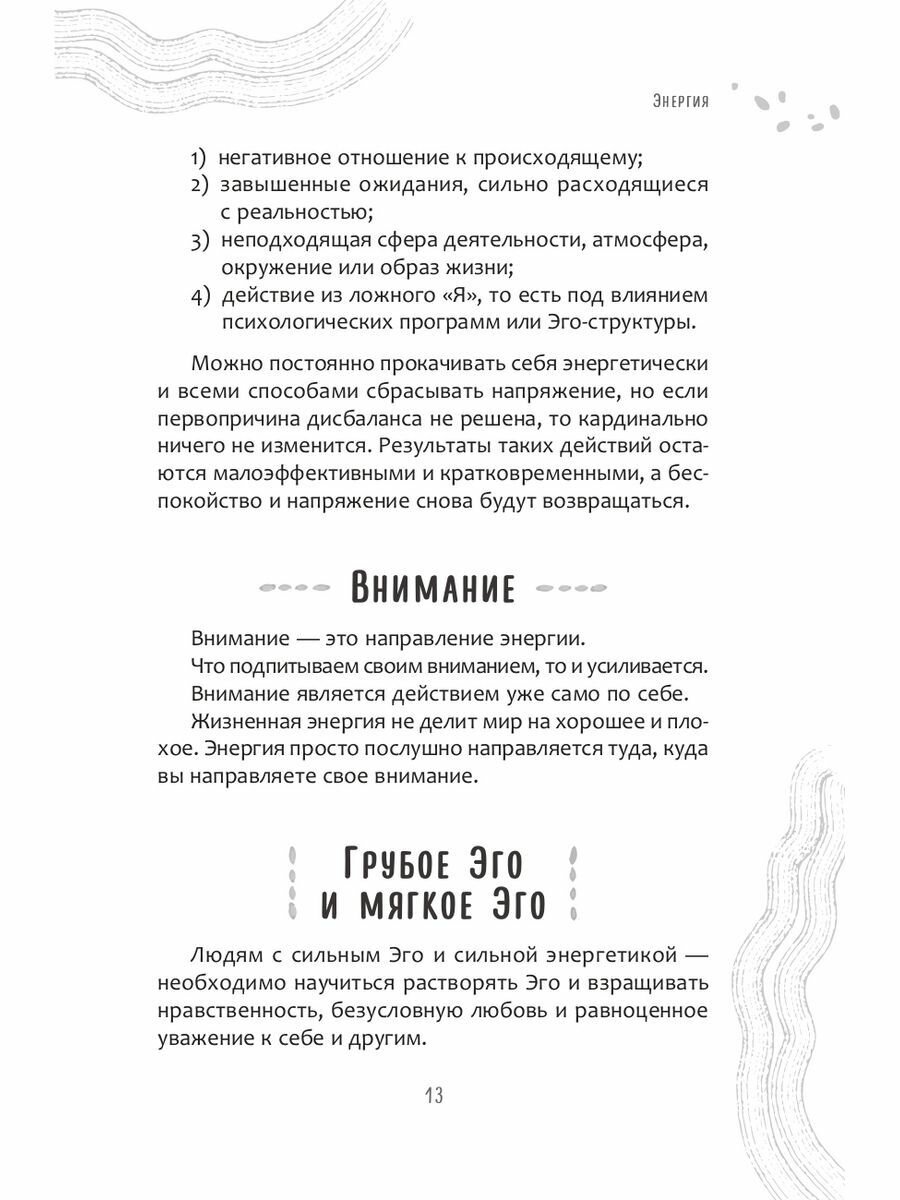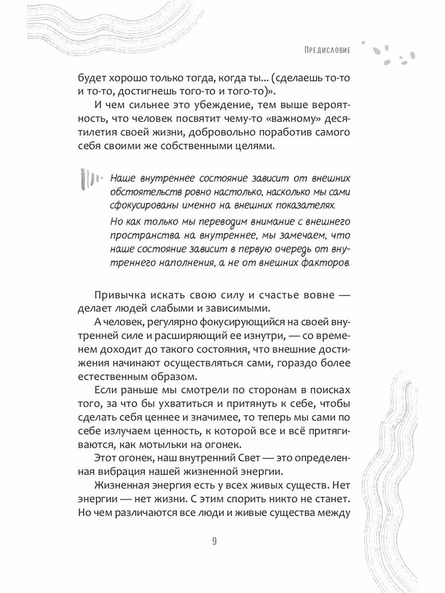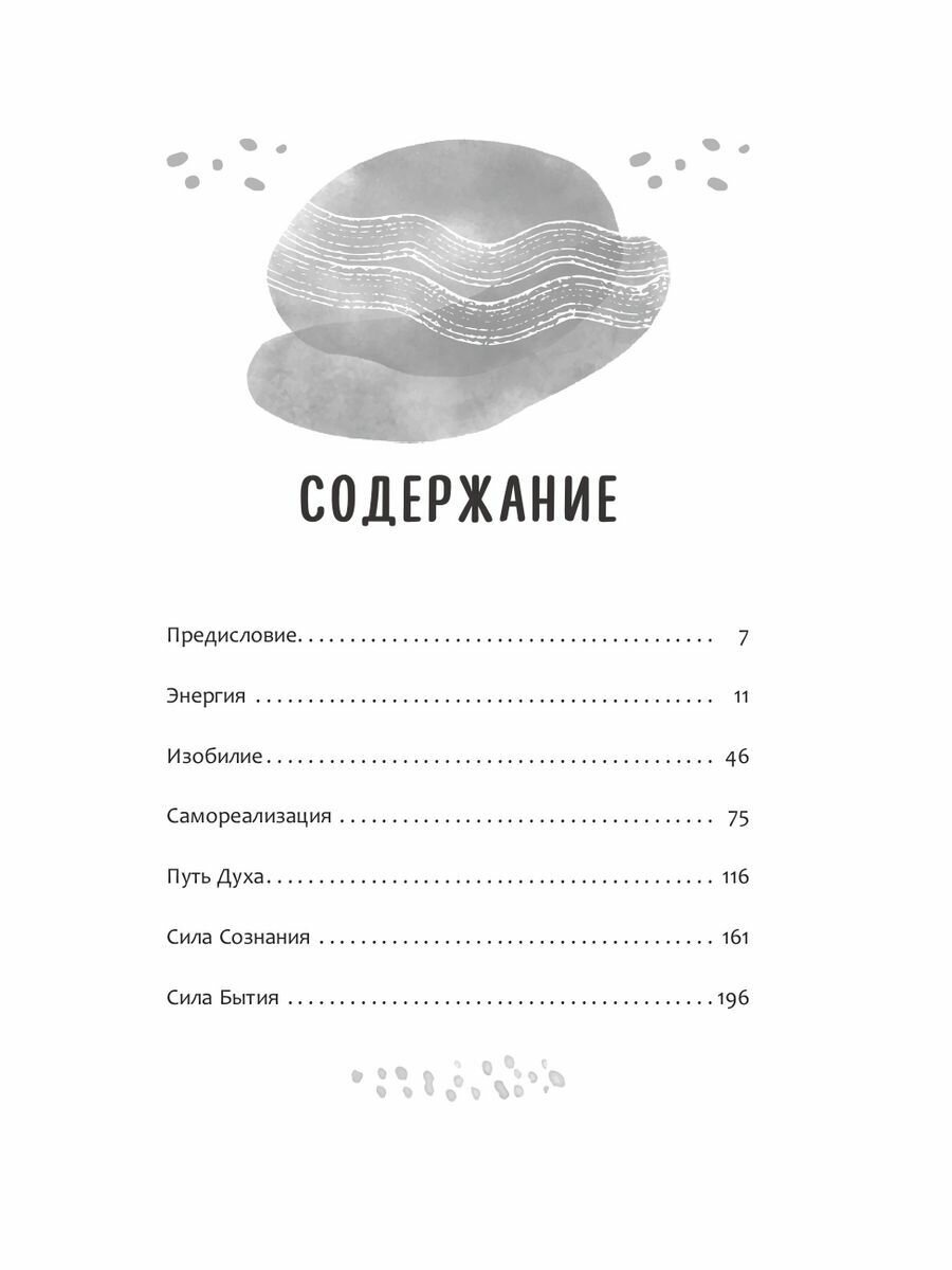 Отдельные разделы посвящены духовному самопознанию — для гармоничного расставления приоритетов в своей жизни, и вхождению в резонанс с пульсацией Вселенной — когда само бытие становится бесперебойным источником энергии, открывающим для человека все многообразие способов самовыражения.
