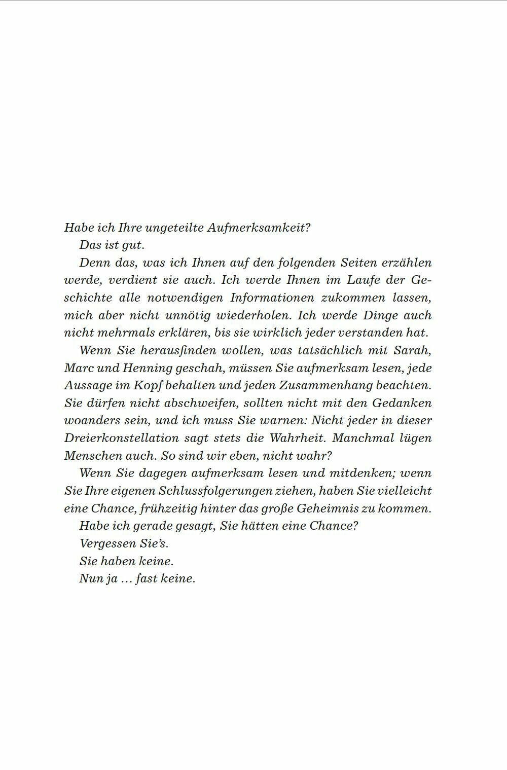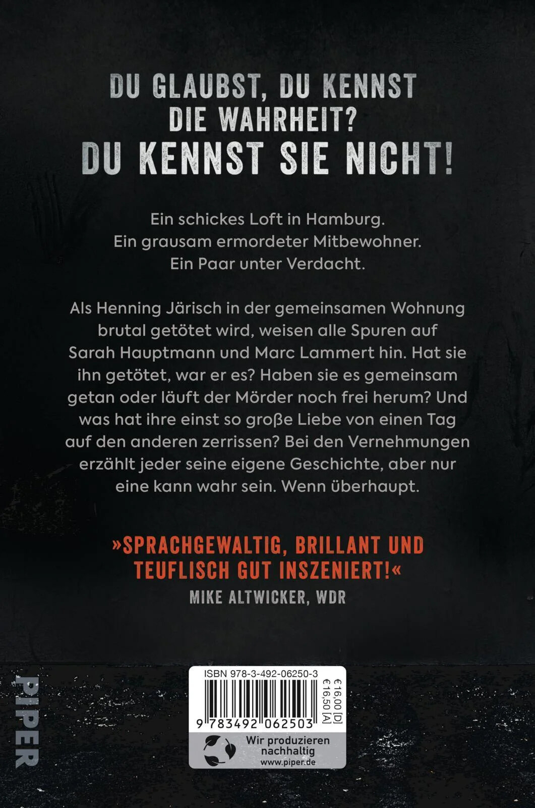 Ein schickes Loft in Hamburg. Ein Paar Anfang drei?ig, Sarah und Marc, und ihr Mitbewohner Henning, Marcs bester Freund. Drei Jahre lang sind sie aufs Engste verbunden, teilen ihre Traume und Sehnsuchte. So scheint es zumindest. Dann aber wird Henning grausam ermordet, und samtliche Spuren deuten auf Sarah und Marc. Hat sie ihn getotet, war er es? Haben sie es gemeinsam getan? Und was hat ihre einst so gro?e Liebe von einen Tag auf den anderen zerrissen? Bei den Vernehmungen erzahlt jeder seine eigene Geschichte, aber nur eine ist wahr. Wenn uberhaupt …