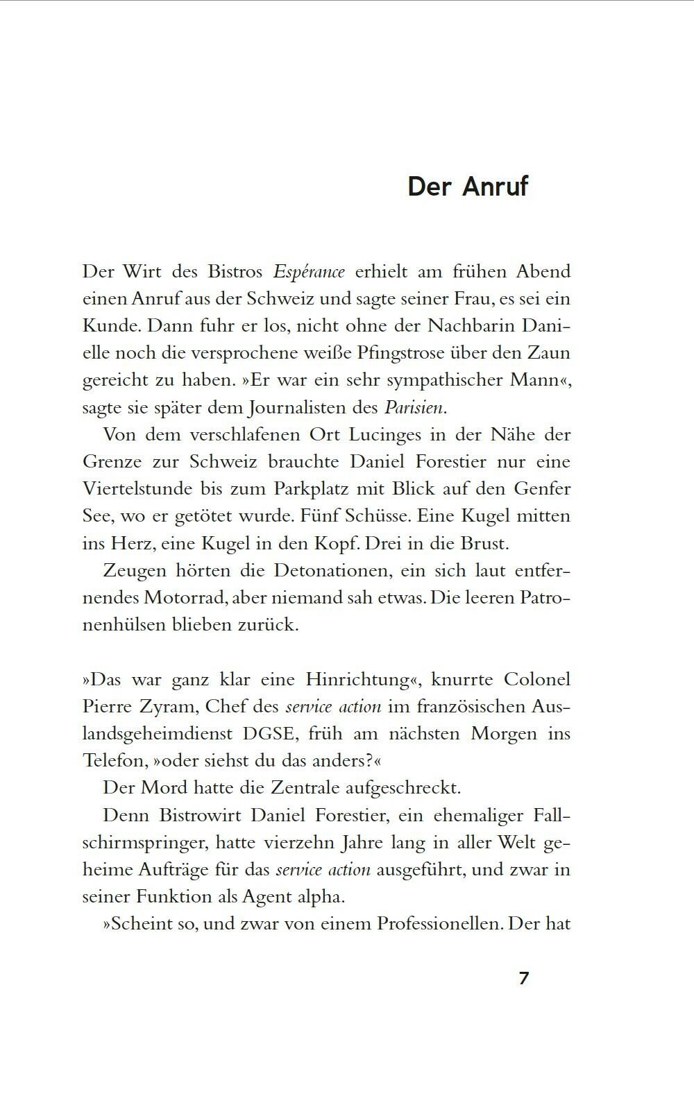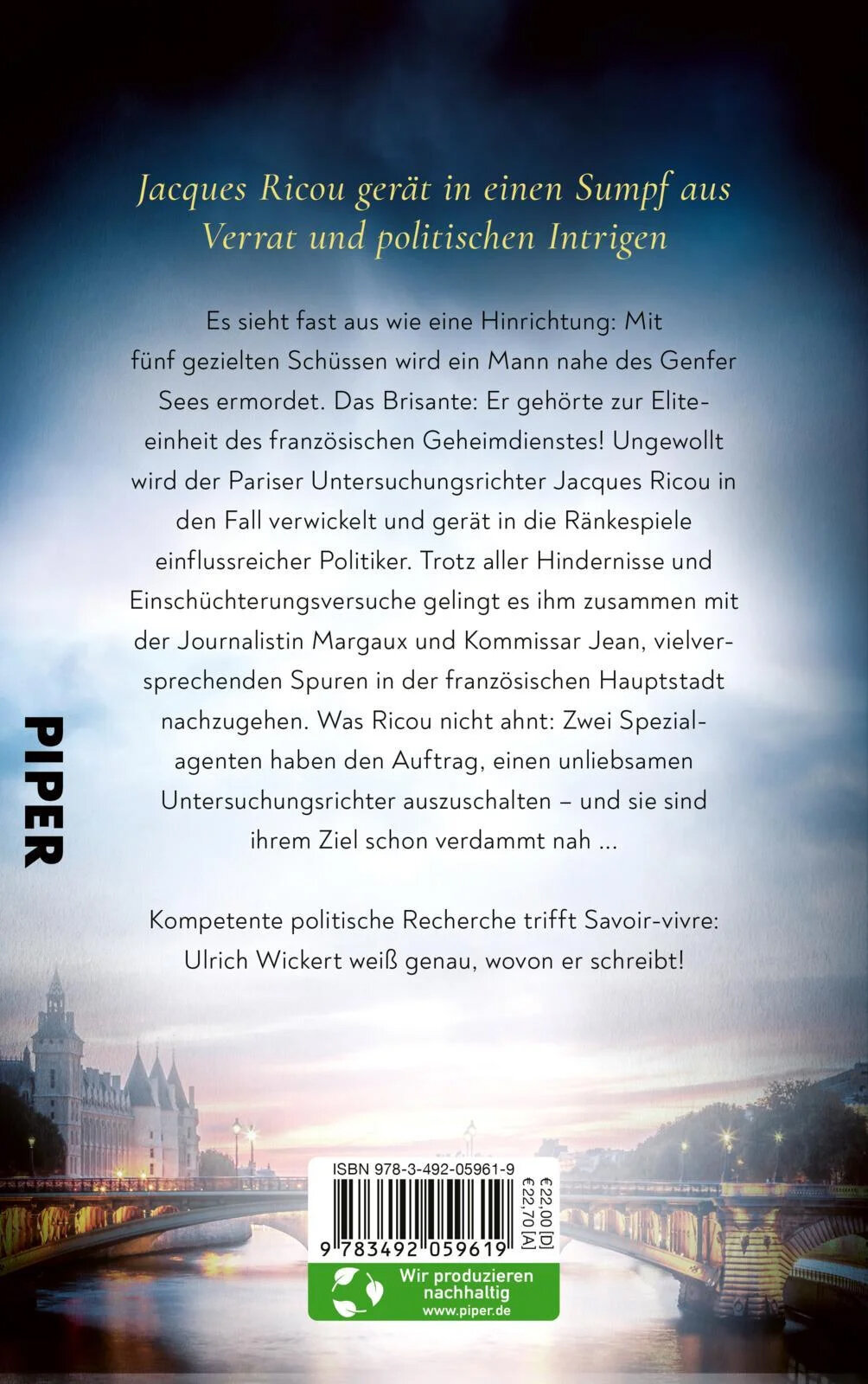 Es sieht fast aus wie eine Hinrichtung. Mit funf gezielten Schussen wurde ein Mann auf einem Parkplatz nahe des Genfer Sees ermordet. Das Brisante: Er gehorte zur Eliteeinheit des franzosischen Geheimdienstes! Ungewollt wird der Pariser Untersuchungsrichter Jacques Ricou in den Fall verwickelt und gerat in die Rankespiele einflussreicher Politiker. Doch trotz aller Behinderungen und Einschuchterungsversuche gelingt es ihm zusammen mit der Journalistin Margaux und Kommissar Jean viel versprechenden Spuren in der franzosischen Hauptstadt nachzugehen. Was Ricou nicht ahnt: Zwei Spezialagenten haben den Auftrag, einen unliebsamen Untersuchungsrichter auszuschalten – und sie sind ihrem Ziel schon verdammt nah ...