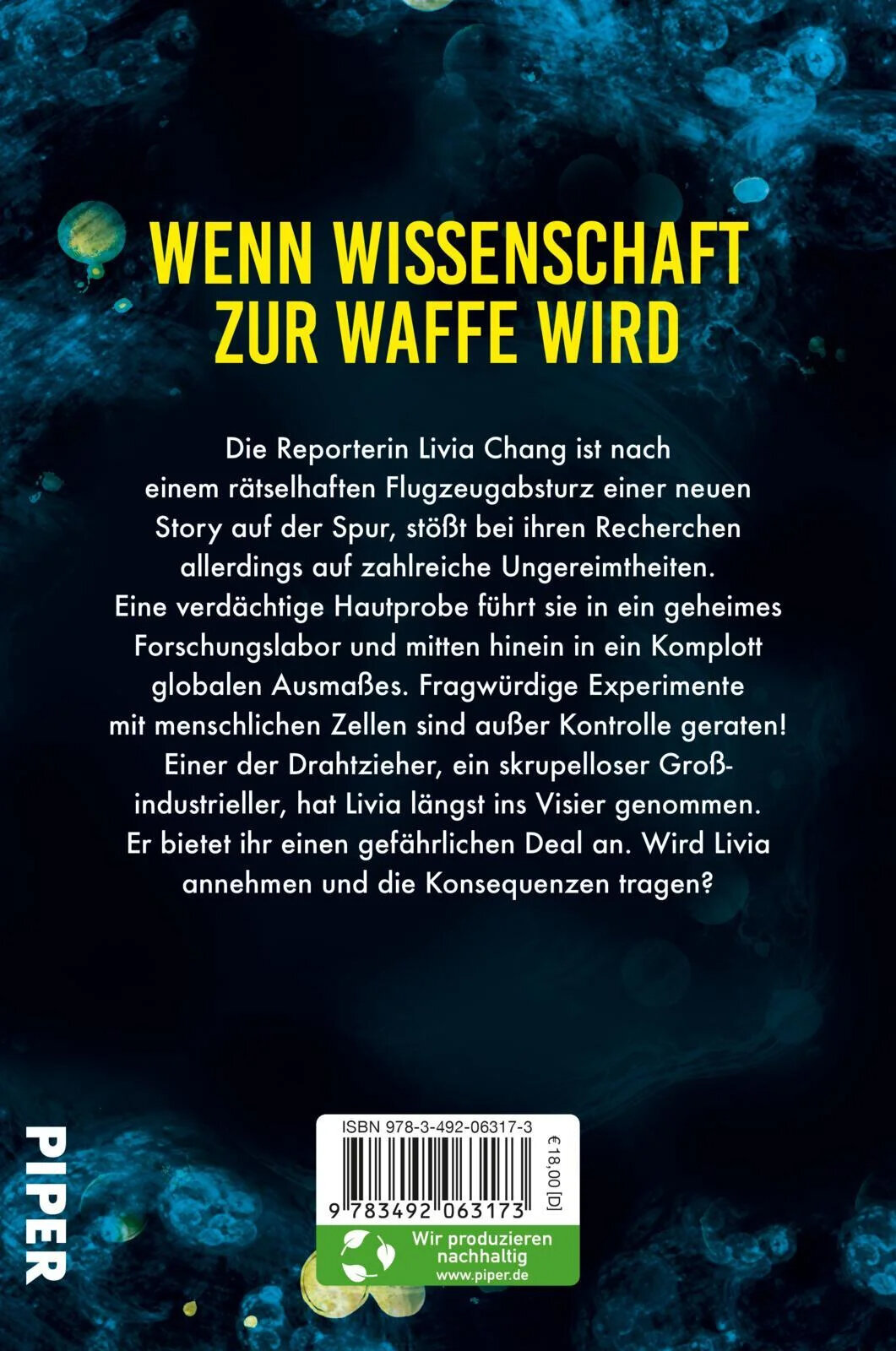 In den USA sturzt ein Flugzeug unter ratselhaften Umstanden ab. In Honduras kommt es zu einer Reihe brutaler Morde. Als die Reporterin Livia Chang den Fall untersucht, sto?t sie auf bizarre Ungereimtheiten: Eine verdachtige Hautprobe, ein geheimes Forschungslabor, aggressive Meerestiere, ein chinesischer Magnat. Nach und nach kommt sie einem Komplott ungeheuerlichen Ausma?es auf die Spur. Menschenversuche sind au?er Kontrolle geraten. Wird sie selbst Opfer dieser Machenschaften? Vor scheinbar unlosbare Aufgaben gestellt, muss sie nicht nur ihre eigene Familie retten, sondern auch einen Anschlag auf hochster politischer Ebene vereiteln.