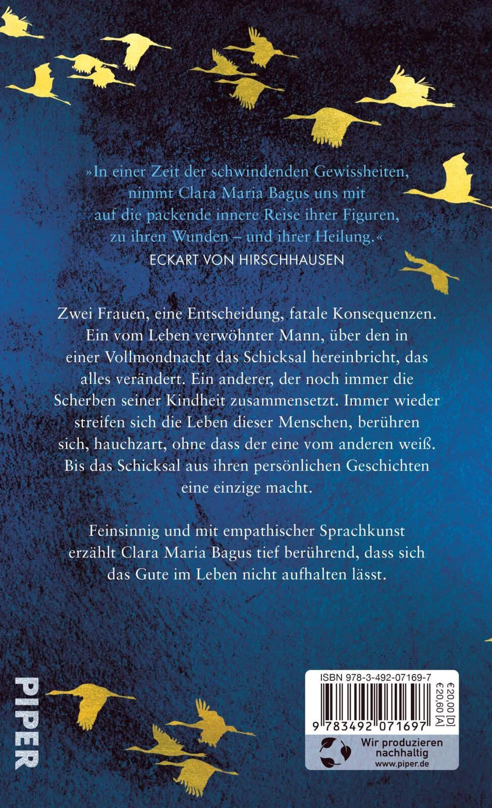 Kennen Sie dieses Gefuhl? Manchmal mochte man einfach aus dem Leben verschwinden. Zwei Frauen, eine Entscheidung, fatale Konsequenzen. Ein vom Leben verwohnter Mann, uber den in einer Vollmondnacht das Schicksal hereinbricht, das alles verandert. Ein anderer, der noch immer die Scherben seiner Kindheit zusammensetzt. Immer wieder streifen sich die Leben dieser Menschen, beruhren sich, hauchzart, ohne dass der eine vom anderen wei?. Bis das Schicksal aus ihren personlichen Geschichten eine einzige macht. Ein Roman, der heilt und uns mit dem Leben versohnt. Feinsinnig und mit empathischer Sprachkunst erzahlt Clara Maria Bagus tief beruhrend, dass sich das Gute im Leben nicht aufhalten lasst.