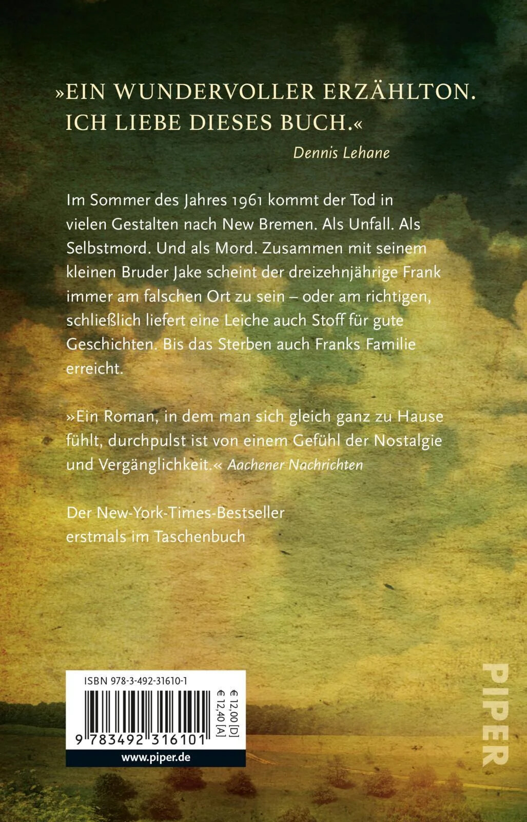 Im Sommer des Jahres 1961 kommt der Tod in vielen Formen nach New Bremen. Als Unfall. Als Selbstmord. Und als Mord. Zusammen mit seinem kleinen Bruder Jake scheint der dreizehnjahrige Frank immer am falschen Ort zu sein – oder am richtigen, schlie?lich liefert eine Leiche auch Stoff fur gute Geschichten. Bis das Sterben auch Franks Familie heimsucht. Plotzlich tut sich vor den Brudern die ganze Welt der Erwachsenen auf, und der Tod fordert von allen eine Entscheidung: fur die Familie, die Freunde und das Leben.