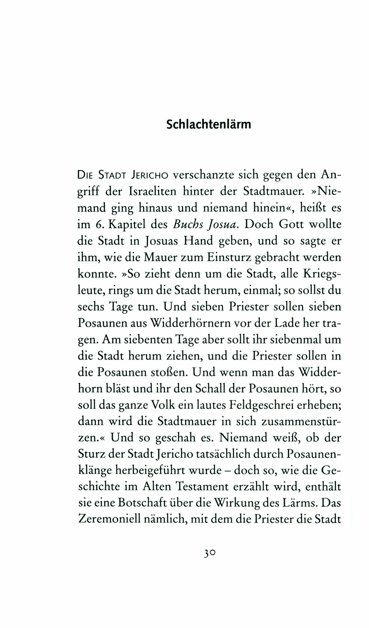Angeblich kommt eine medizinische Studie zu dem Schluss, dass bei einem Umgebungslarm von 65 Dezibel das Herzinfarktrisiko um uber 30 % hoher ist als bei 60 Dezibel – allerdings nur bei Mannern, bei Frauen nicht. Warum das so ist, wei? niemand. Larm muss nicht laut sein – auch ein tickender Wecker oder ein tropfender Wasserhahn konnen einen in den Wahnsinn treiben, wahrend das ohrenbetaubende Brullen eines Gebirgsbachs als naturlich und damit schon empfunden wird. Nur wer mit Gerauschen umzugehen wei?, kann sie ertragen.