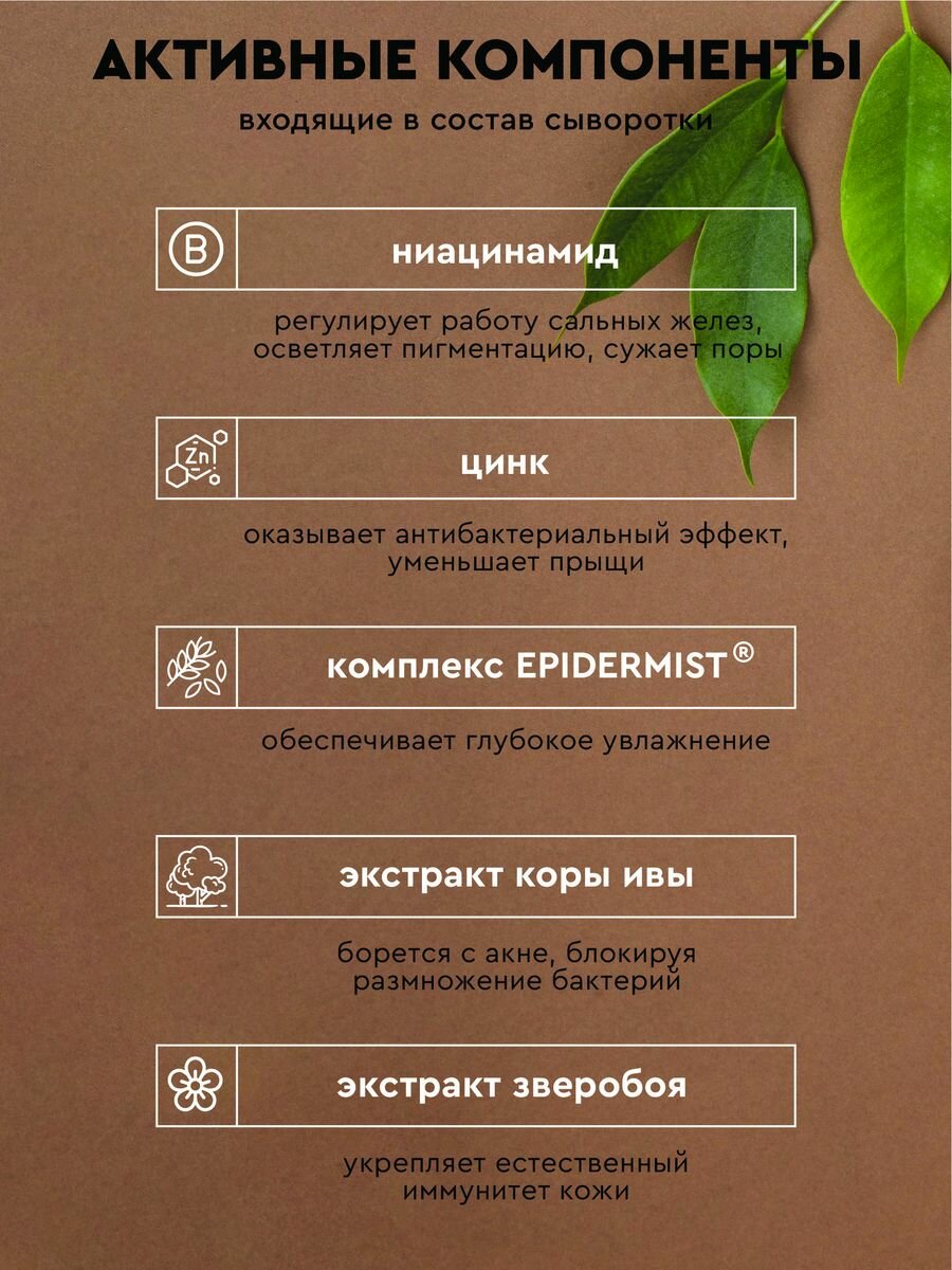 | Химический состав | Aqua, Niacinamide, Glycerin, Saccaride Isomerate, Xanthan Gum, Hypericum Perforatum Extract, Salix Alba Bark Extract, Zn PCA, Rosmarinus Officinalis Essential Oil, Citrus Limon Essential Oil, Benzyl Alcohol, Ethylhexylglycerin, Lactic Acid, Tetrasodium Glutamate Diacetate, Linalool*, limonene*, Geraniol*. * компоненты натуральных эфирных масел |