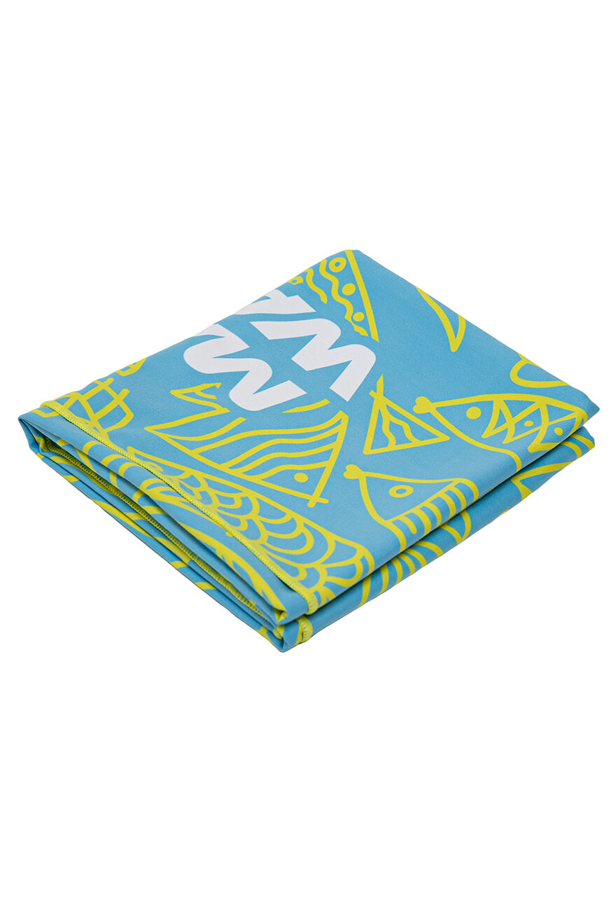 A compact sports towel with a design. This microfiber towel weighs significantly less than a conventional cotton towel of comparable size. Thanks to its unique hygroscopic properties, the microfiber towel excels at moisture absorption, dries quickly, and takes up minimal space in your bag. It's suitable for individuals with sensitive skin and doesn't trigger allergies. It can be used for workouts in the gym and at the pool, for swimming, sauna, fitness, yoga, running, and various other sports activities, or as a lightweight beach blanket for sunbathing, for outdoor activities such as hiking and picnics. The density is 210 g/m3.